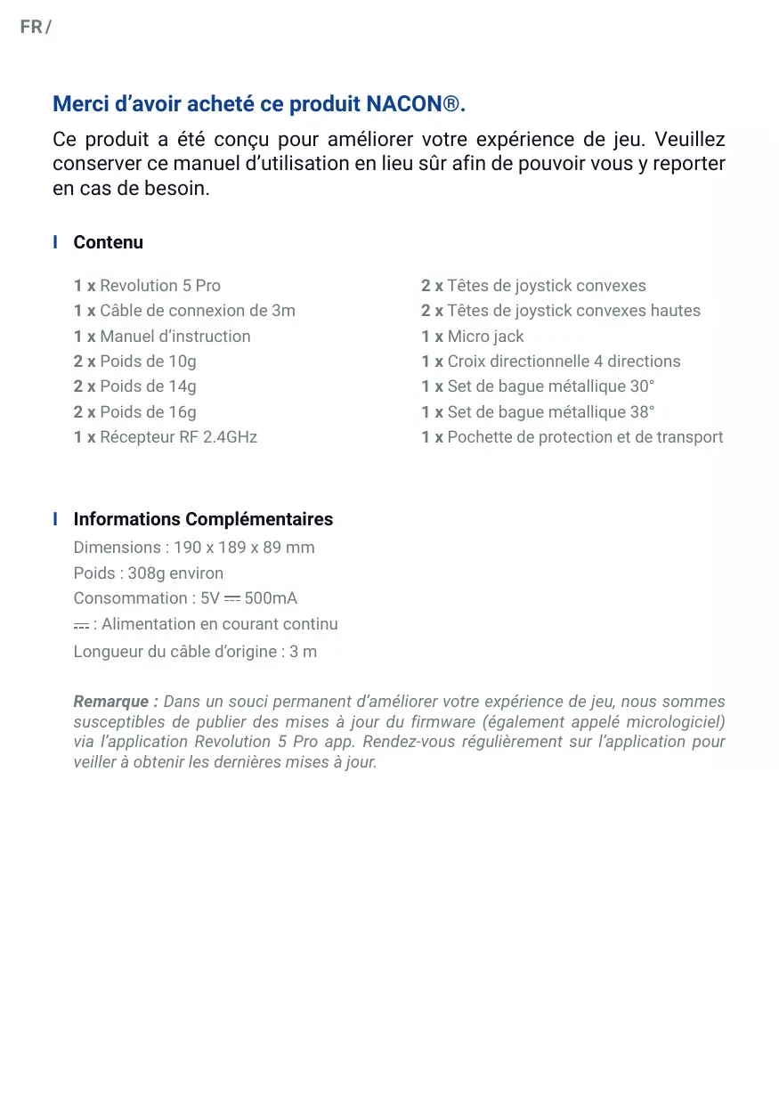 FR/ Merci d'avoir acheté ce produit NACON®. Ce produit a été conçu pour améliorer votre expérience de jeu. Veuillez conserver ce manuel d'utilisation en lieu sûr afin de pouvoir vous y reporter en cas de besoin. 1 Contenu 1 x Revolution 5 Pro 2 x Têtes de joystick convexes 1 x Câble de connexion de 3m 2 x Têtes de joystick convexes hautes 1 x Manuel d'instruction 1x Micro jack 2 x Poids de 10g 1 x Croix directionnelle 4 directions 2 x Poids de 14g 1 x Set de bague métallique 30° 2 x Poids de 16g 1 x Set de bague métallique 38° 1 x Récepteur RF 2.4GHz 1 x Pochette de protection et de transport 1 Informations Complémentaires Dimensions : 190 x 189 x 89 mm Poids : 308g environ Consommation : 5V — 500mA ==: Alimentation en courant continu Longueur du câble d'origine : 3m Remarque : Dans un souci permanent d'améliorer votre expérience de jeu, nous sommes susceptibles de publier des mises à jour du firmware (également appelé micrologiciel) via l'application Revolution 5 Pro app. Rendez-vous régulièrement sur l'application pour veiller à obtenir les dernières mises à jour.