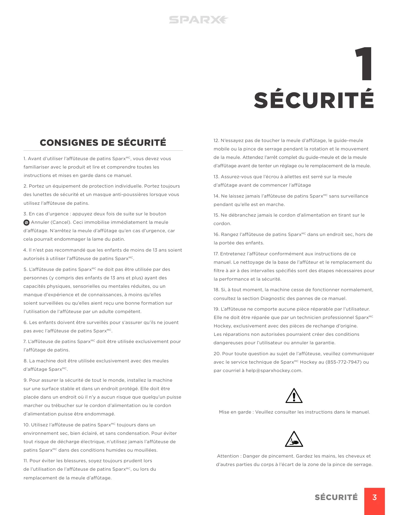 14. Ne laissez jamais l'affûteuse de patins Sparx*° sans surveillance