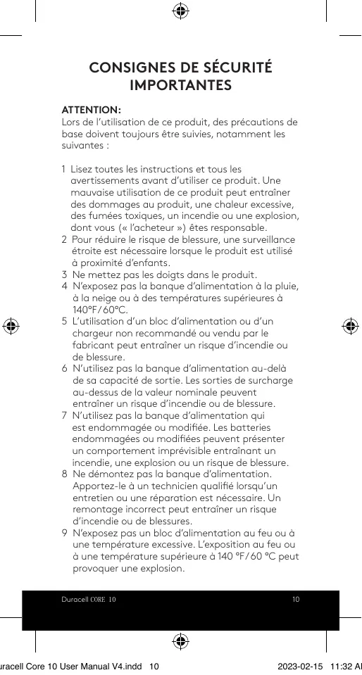Retrouvez gratuitement la notice de l'appareil CORE 10 Duracell au format PDF.
