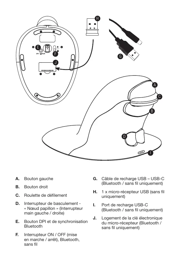Le micro-récepteur USB 2,4 Ghz se trouve à l'intérieur du logement situé en dessous de la souris Penguin (J).