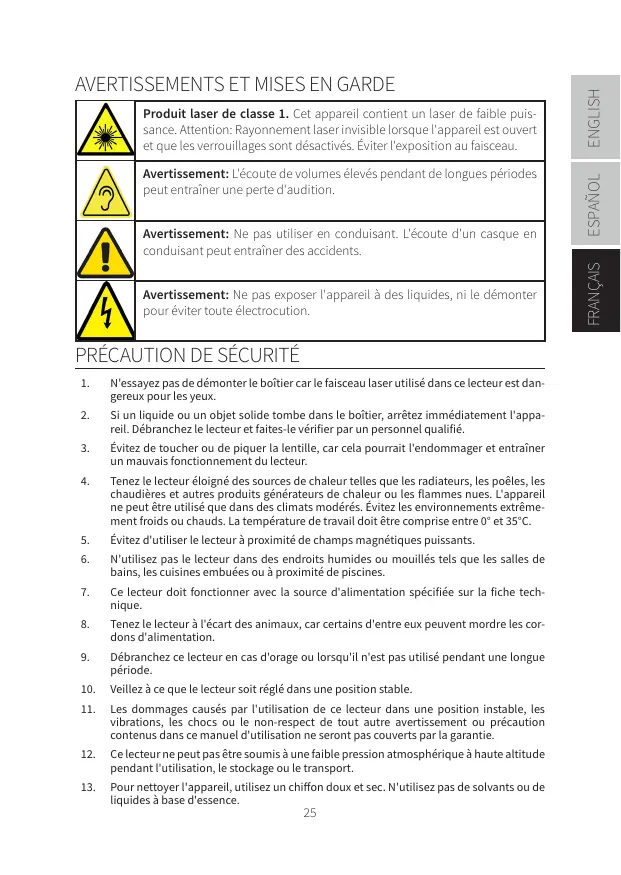 Tenez le lecteur éloigné des sources de chaleur telles que Les radiateurs, les poêles, les chaudières et autres produits générateurs de chaleur ou les flammes nues. L'appareil ne peut être utilisé que dans des climats modérés. Évitez les envirannements extrême. ment froids ou chauds. La température de travail doit être comprise entre 0” et 35°C.