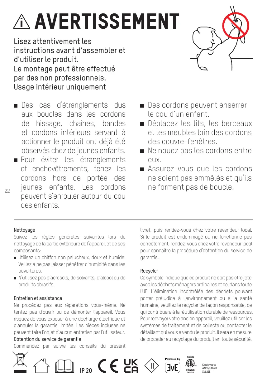AVERTISSEMENT : instructions de sécurité importantes. Suivez toutes les instructions, car une installation incorrecte peut entrainer des blessures graves à plus de 2,5 m au-dessus du sol ou à un autre niveau pouvant en permettre l'accès.