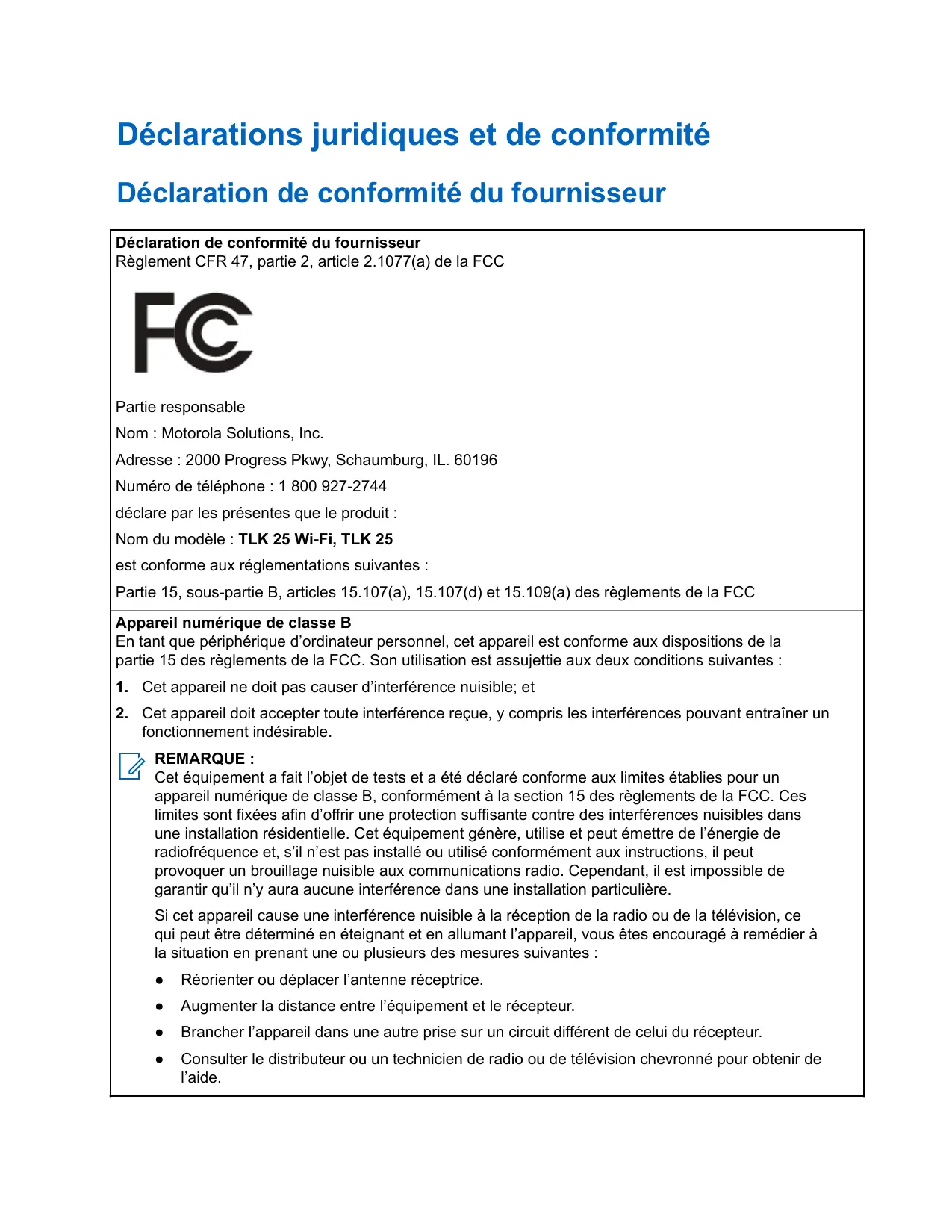 Règlement CFR 47, partie 2, article 2.1077(a) de la FCC C Partie responsable