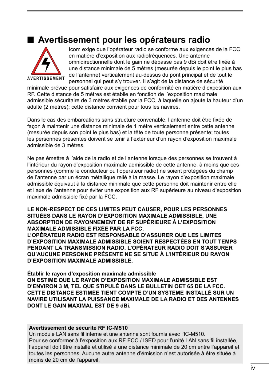L'OPÉRATEUR RADIO EST RESPONSABLE D'ASSURER QUE LES LIMITES D’EXPOSITION MAXIMALE ADMISSIBLE SOIENT RESPECTÉES EN TOUT TEMPS PENDANT LA TRANSMISSION RADIO. L'OPÉRATEUR RADIO DOIT S'ASSURER QU'AUCUNE PERSONNE PRÉSENTE NE SE SITUE À L'INTÉRIEUR DU RAYON D'EXPOSITION MAXIMALE ADMISSIBLE.