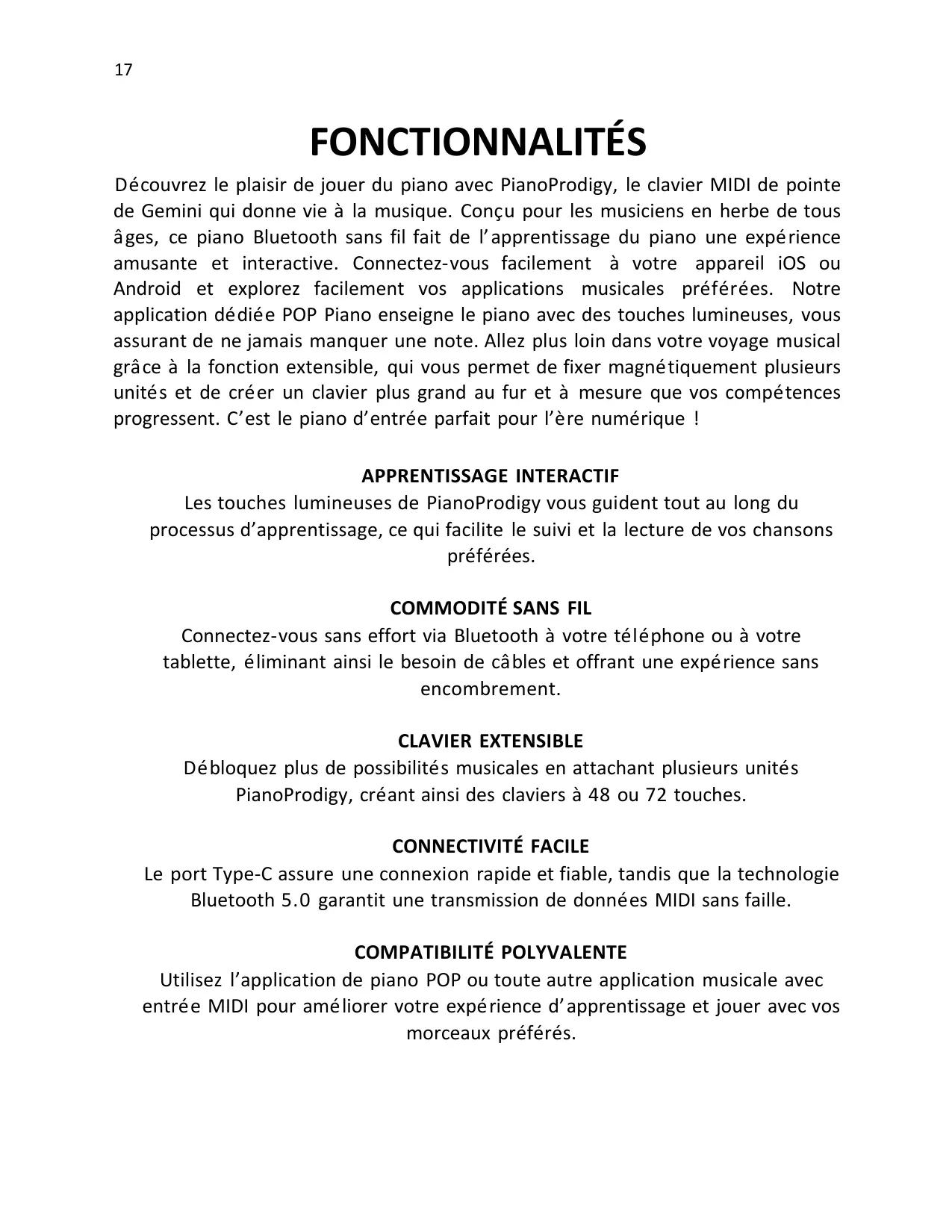 COMPATIBILITÉ POLYVALENTE Utilisez l'application de piano POP ou toute autre application musicale avec entrée MIDI pour améliorer votre expérience d'apprentissage et jouer avec vos morceaux préférés.
