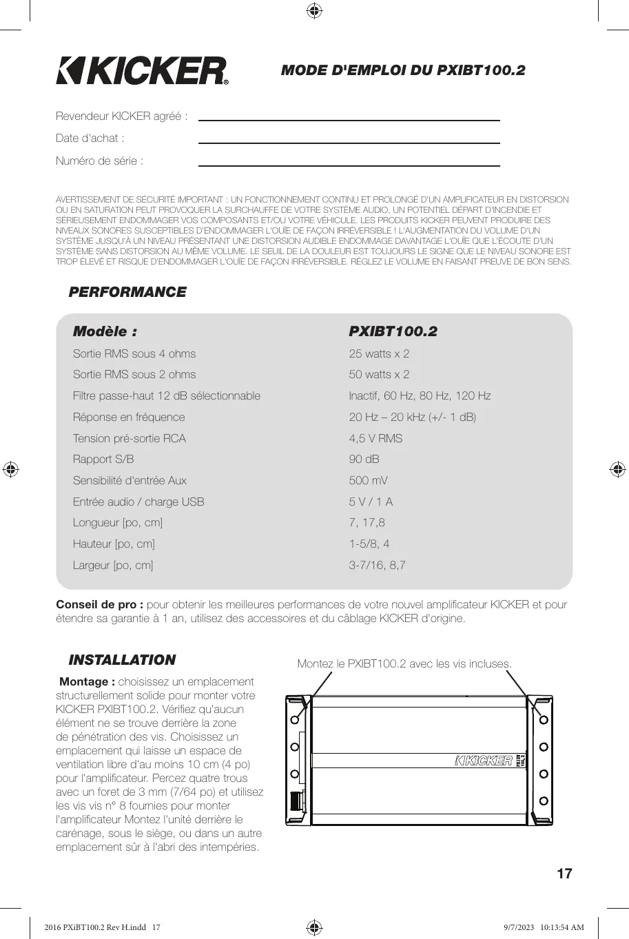 PXIBT100.2 - Amplificateur KICKER - Notice d'utilisation et mode d'emploi gratuit