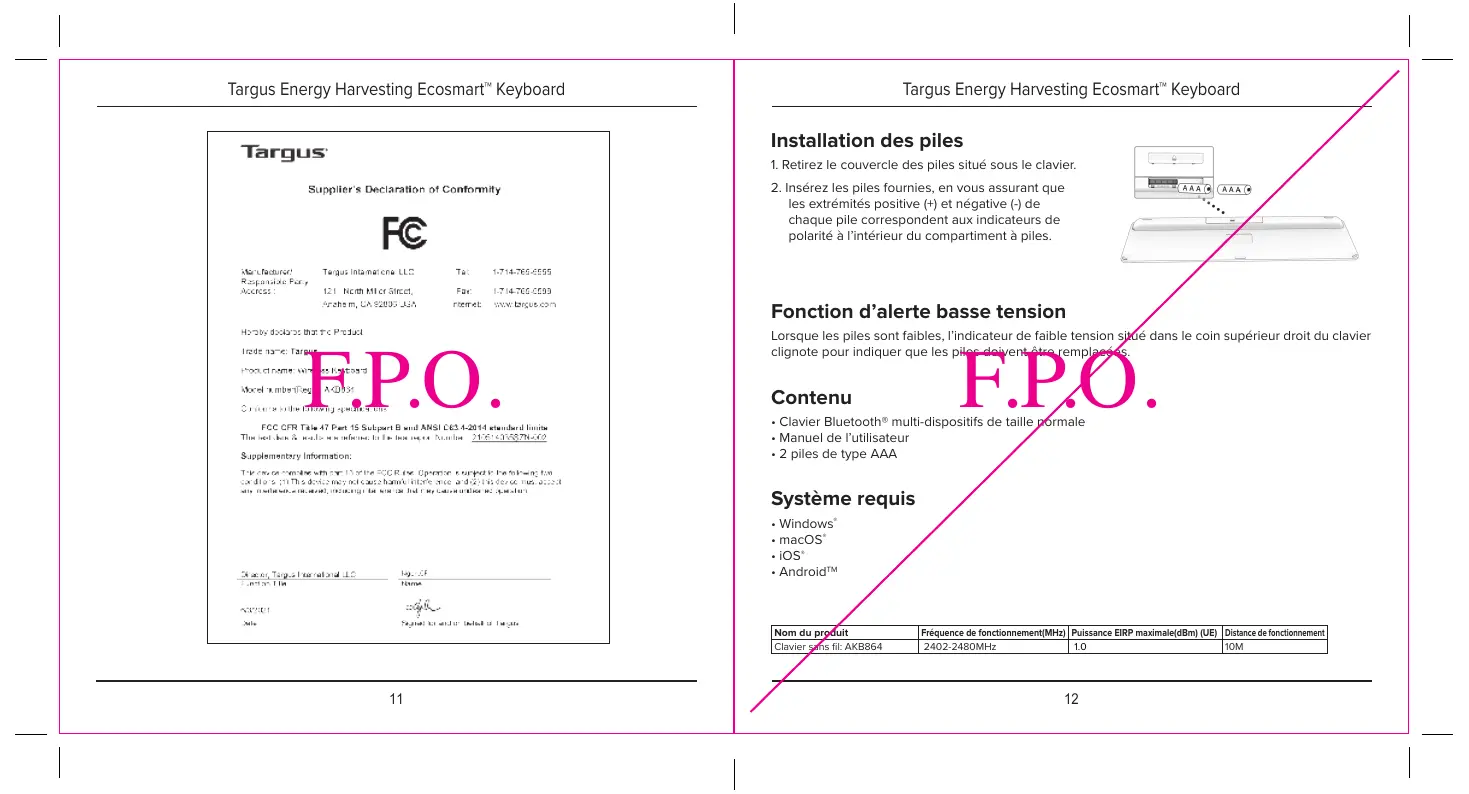 Insérez les piles fournies, en vous assurant que les extrémités positive (+) et négative () de chaque pile correspondent aux indicateurs de polarité à l'intérieur du compartiment à piles. Fonction d’alerte basse tension Lorsque les piles sont faibles, l'indicateur de faible tension clignote pour indiquer que les pi engtsag em piges fé dans le coin supérieur droit du clavier Contenu . + Clavier Bluetooth® multi-dispositifs de taille + Manuel de l'utilisateur +2 piles de type AAA Système requis + Windows” + macos” +105" + Android [Rom du prpdôit TFréauenee den Puissance ERP me QUES Joie et ] [avier gs 1e AKESS | 2407-2480 fo from