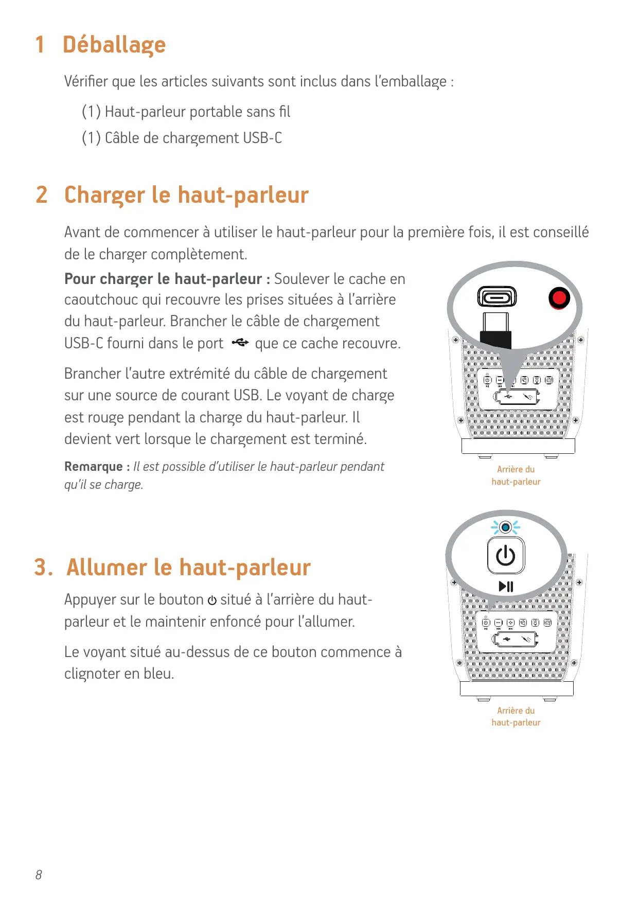 “ connecte Le câble de chargement USB-C fourni pour allumer ou charger le haut- parleur.
