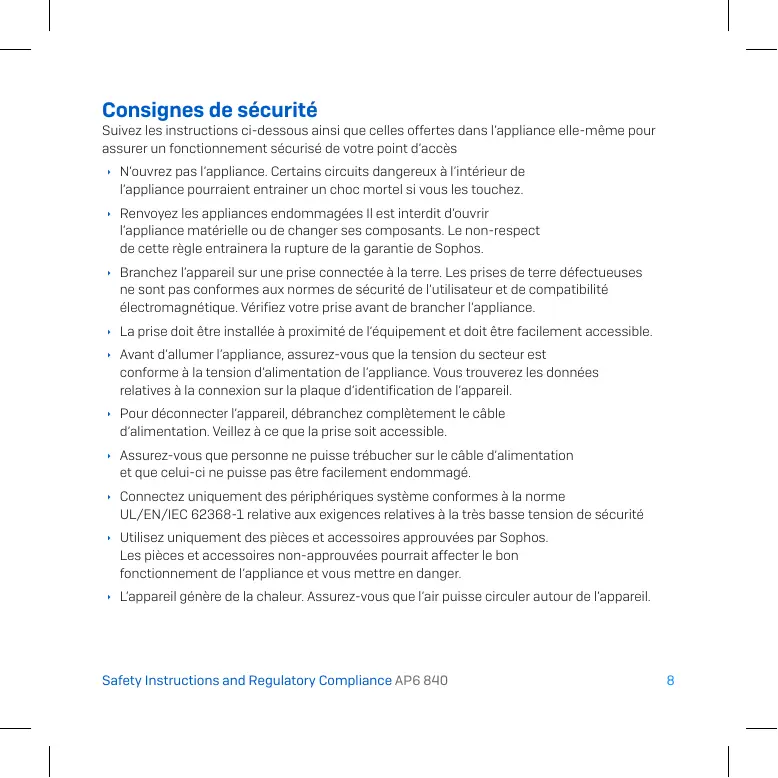 Consignes de sécurité Suivez les instructions ci-dessous ainsi que celles offertes dans l'appliance elle-même pour assurer un fonctionnement sécurisé de votre point d'accès + N'ouvrez pas l'appliance. Certains circuits dangereux à l'intérieur de l'appliance pourraient entrainer un choc mortel si vous les touchez. + Renvoyez les appliances endommagées Il est interdit d'ouvrir l'appliance matérielle ou de changer ses composants. Le non-respect de cette règle entrainer la rupture de la garantie de Sophos.