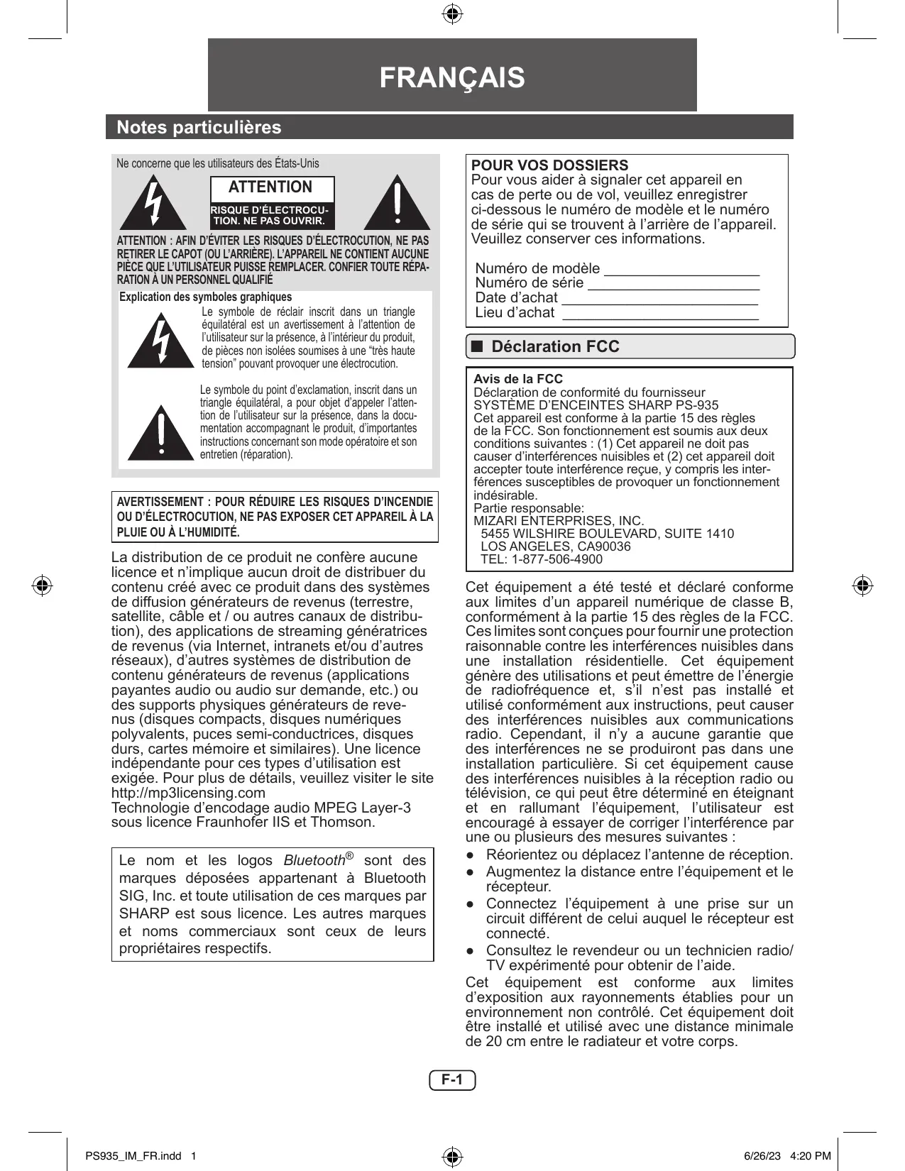 MODE D'EMPLOI PS-935 SHARP