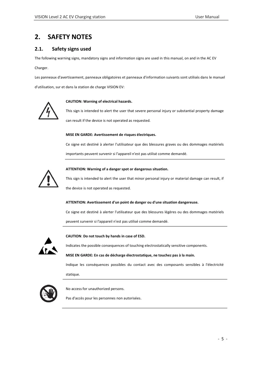 The following warning signs, mandatory signs and information signs are used in his manual, on and in the AC EV Charger.