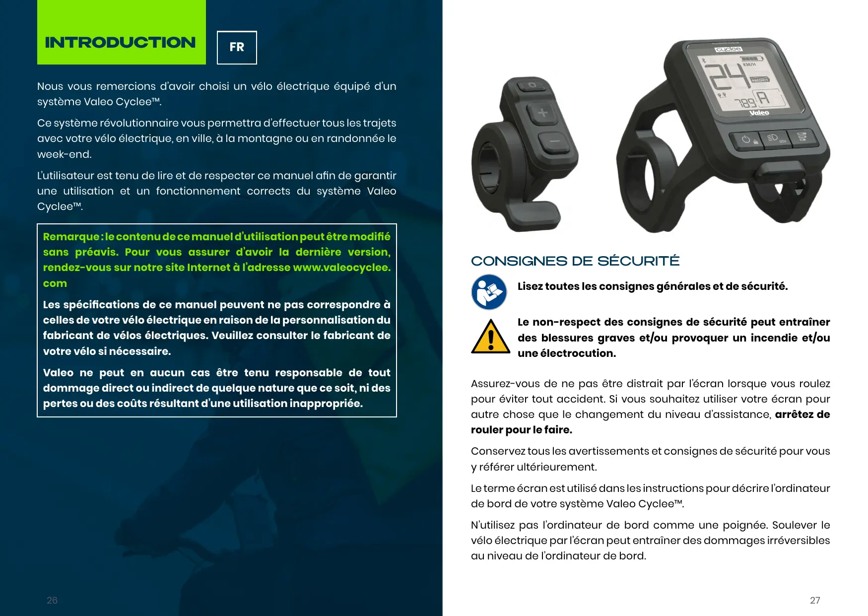Lutilisateur est tenu de lire et de respecter ce manuel afin de garantir une utilisation et un fonctionnement corrects du système Valeo Cyclee".