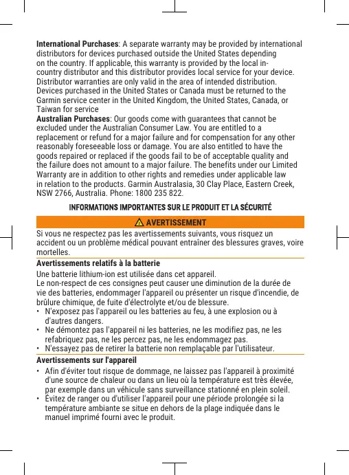 Achats internationaux : selon les pays, une garantie distincte peut être accordée par es distributeurs intemationaux pour es appareils achetés hors des Etats-Unis. Le cas échéant, cette garantie est fournie par le distributeur du pays d'achat et ledit distributeur prend en charge les services locaux nécessaires pour votre appareil. Les garanties distributeur sont valides uniquement dans les zones de distribution visées. En cas de problème, les appareils achetés aux États-Unis ou au Canada doivent être renvoyés aux ateliers de réparations Garmin du Royaume-Uni, des États-Unis, du Canada ou de Taiwan.