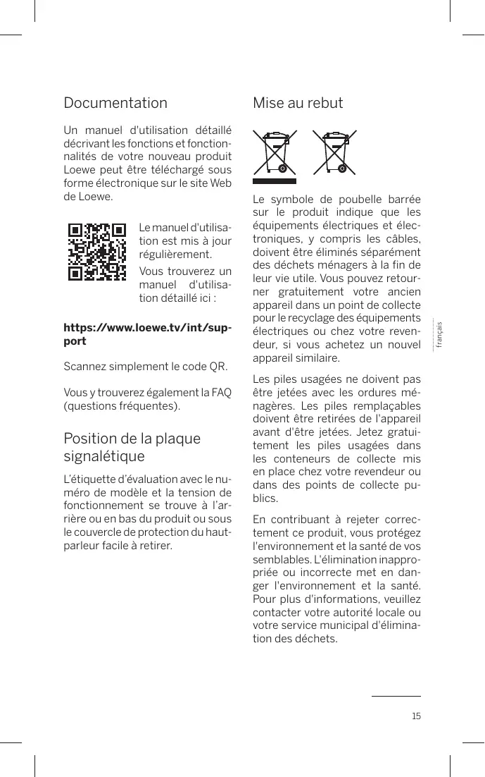 être jetées avec les ordures mé- nagères. Les piles remplaçables doivent être retirées de l'appareil avant d'être jetées. Jetez gratui- tement les piles usagées dans les conteneurs de collecte mis en place chez votre revendeur ou dans des points de collecte pu- blics