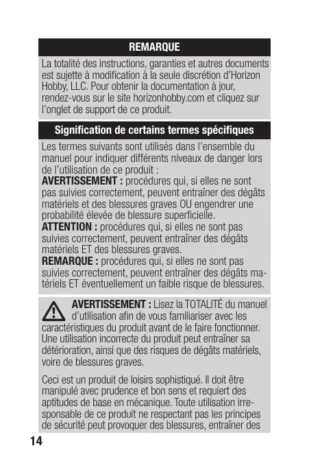 REMARQUE La totalté des instructions, garanties et autres documents est sujette à modification à la seule discrétion d'Horizon Hobby, LLC. Pour obtenir la documentation à jour, rendez-vous sur le site horizonhobby.com et cliquez sur l'onglet de support de ce produit.