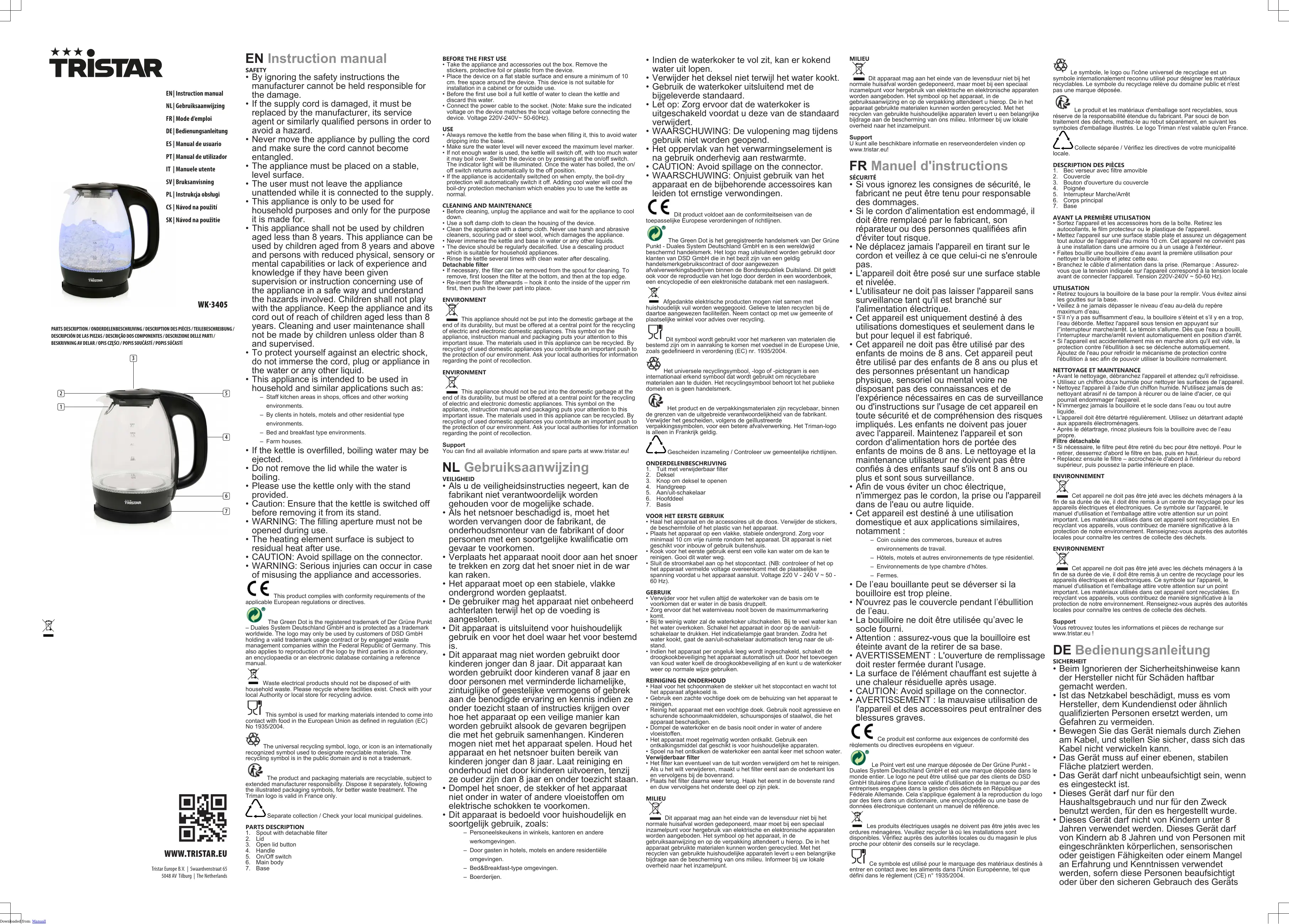 WK-3405 - Bouilloire TRISTAR - Notice d'utilisation et mode d'emploi gratuit