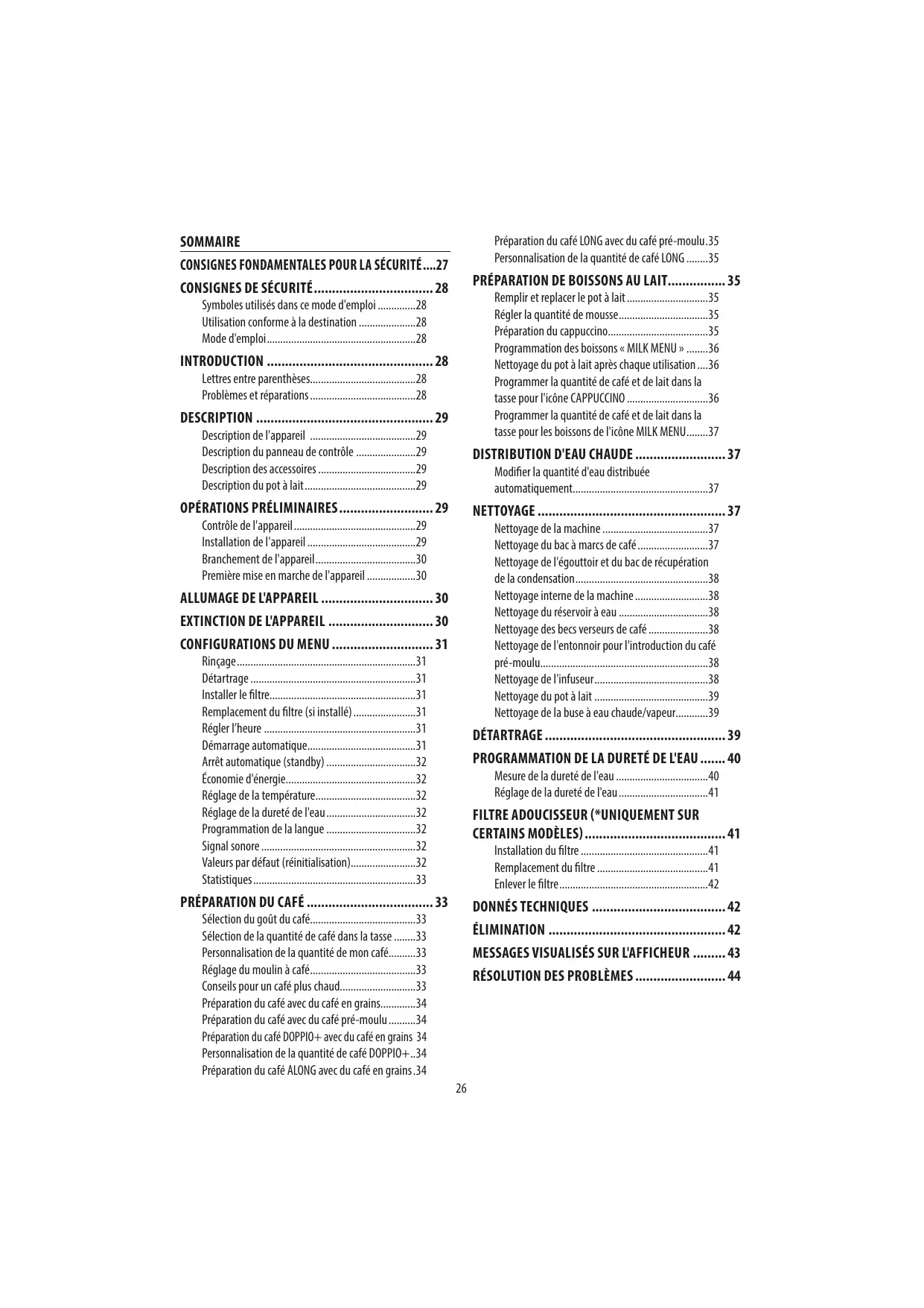 Modifier la quantité d'eau distribuée automatiquement. NETTOYAGE … Nettoyage dela machin . Nettoyage du bac à marcs de café. 37 Nettoyage de l'égouttoir et du bac de récupération de la condensation. Nettoyage interne de la machine Nettoyage du réservoir à eau Nettoyage des becs verseurs de café. Nettoyage de l'entonnoir pour l'introduction du café pré-moulu. 38 Nettoyage de linfuseur. 38 Nettoyage du pot à lait Nettoyage de la buse à eau chaude/vapeur. DÉTARTRAGE . PROGRAMMATION DE LA DURETÉ DE L'EAU . Mesure de la dureté de l'eau . Réglage de la dureté de l'eau