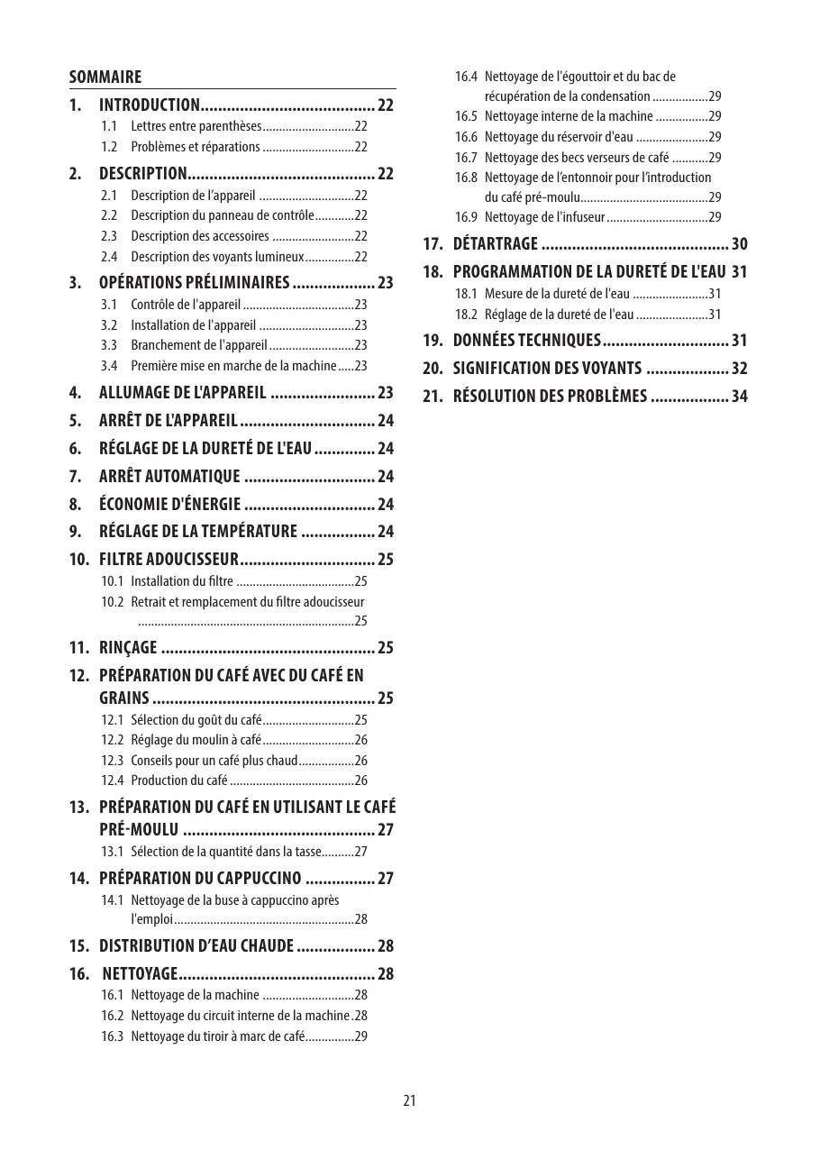 Nettoyage de l'égouttoir et du bac de récupération de la condensatio: Nettoyage interne de la machine . Nettoyage du réservoir d'eau Nettoyage des becs verseurs de café . Nettoyage de l'entonnoir pour l'introduction du café pré-moulu. Nettoyage de l'infusel DÉTARTRAGE ..30