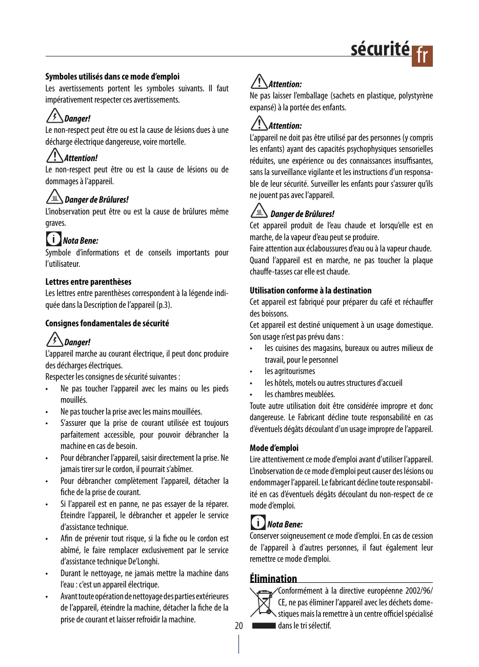 + fin de prévenir tout risque, si la fiche ou le cordon est abimé, le faire remplacer exclusivement par le service d'assistance technique De’Longhi.