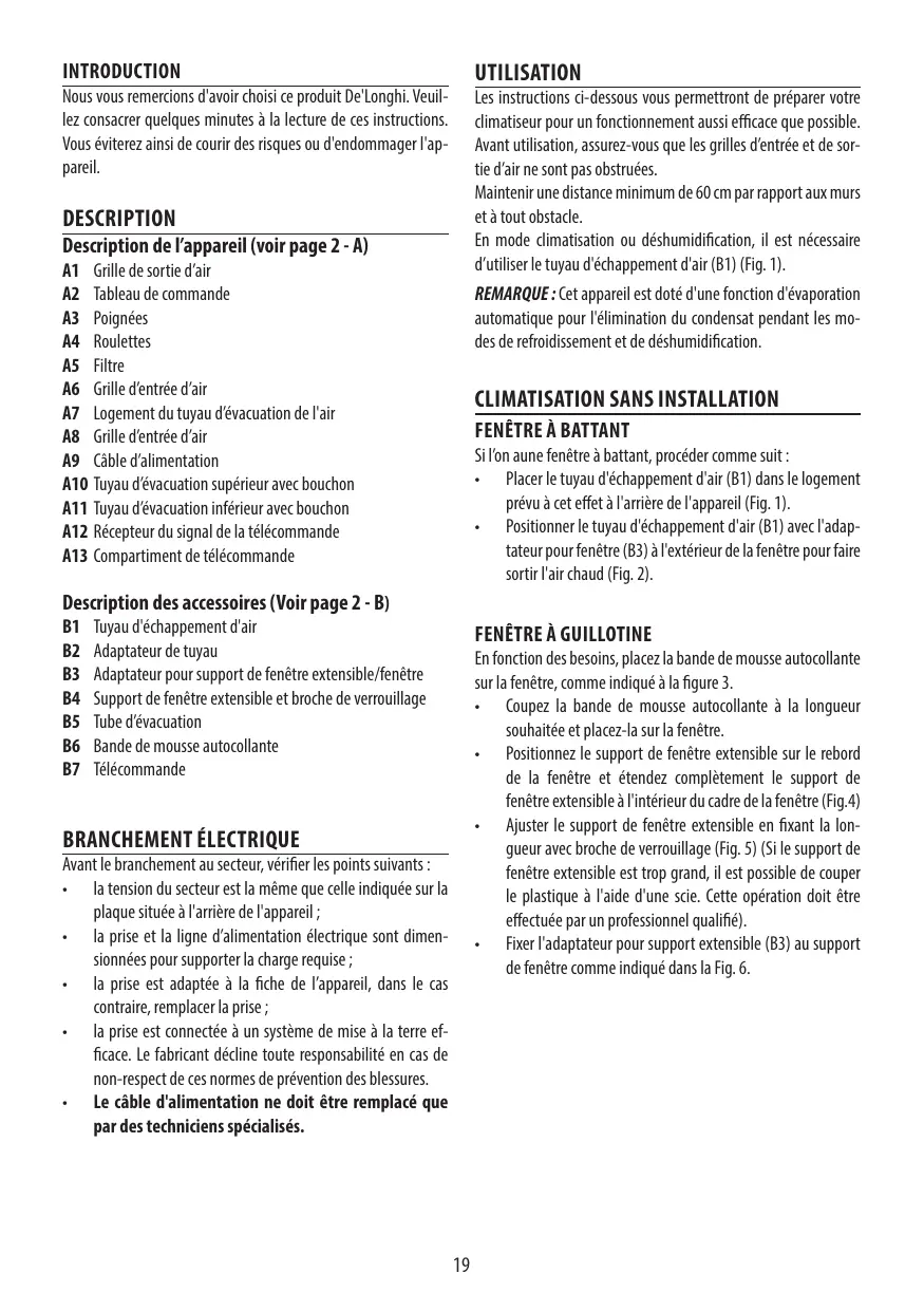INTRODUCTION UTILISATION Nous vous remercions d'avoir choisi ce produit De Longhi. Veuil- lez consacrer quelques minutes à la lecture de ces instructions. Vous éviterez ainsi de courir des risques ou d'endommager l'ap- pareil DESCRIPTION Description de l'appareil (voir page 2 - A) AT Grille de sortie d'air A2 Tableau de commande A3. Poignées A4 Roulettes A5 Filtre A6 Grille d'entrée d'air A7 Logement du tuyau d'évacuation de l'air A8 Grille d'entrée d'air A9 Cble d'alimentation A10 Tuyau d'évacuation supérieur avec bouchon AT1 Tuyau d'évacuation inférieur avec bouchon A12 Récepteur du signal de la télécommande A13 Compartiment de télécommande Description des accessoires (Voir page 2 - B) B1 Tuyau d'échappement d'air Adaptateur de tuyau Adaptateur pour support de fenêtre extensible/fenêtre Support de fenêtre extensible et broche de verrouillage Tube d'évacuation Bande de mousse autocollante Télécommande BRANCHEMENT ÉLECTRIQUE Avant le branchement au secteur, vérifier les points suivants: + lattension du secteur est la même que cell indiquée sur la plaque située à l'arrière de l'appareil ; + la pris et la ligne d'alimentation électrique sont dimen- sionnées pour supporter la charge requise ; + la prise est adaptée à la fiche de l'appareil, dans le cas contraire, remplacer la prise ; + la prise est connectée à un système de mis à la terre ef- ficace. Le fabricant décine toute responsabilité en cas de non-respect de ces normes de prévention des blessures. + Le câble d'alimentation ne doit être remplacé que par des techniciens spécialisés. Les instructions ci-dessous vous permettront de préparer votre dimatiseur pour un fonctionnement aussi efficace que possible. Avant utilisation, assurez-vous que les grilles d'entrée et de sor- tie d'airne sont pas obstruées. Maintenir une distance minimum de 60 cm par rapport aux murs et à tout obstacle. En mode dimatistion ou déshumidification, il est nécessaire d'utiliser le tuyau d'échappement d'air (B1) (Fig. 1). REMARQUE : Cet appareil est doté d'une fonction d'évaporation automatique pour l'élimination du condensat pendant les mo- des de refroidissement et de déshumidiication.