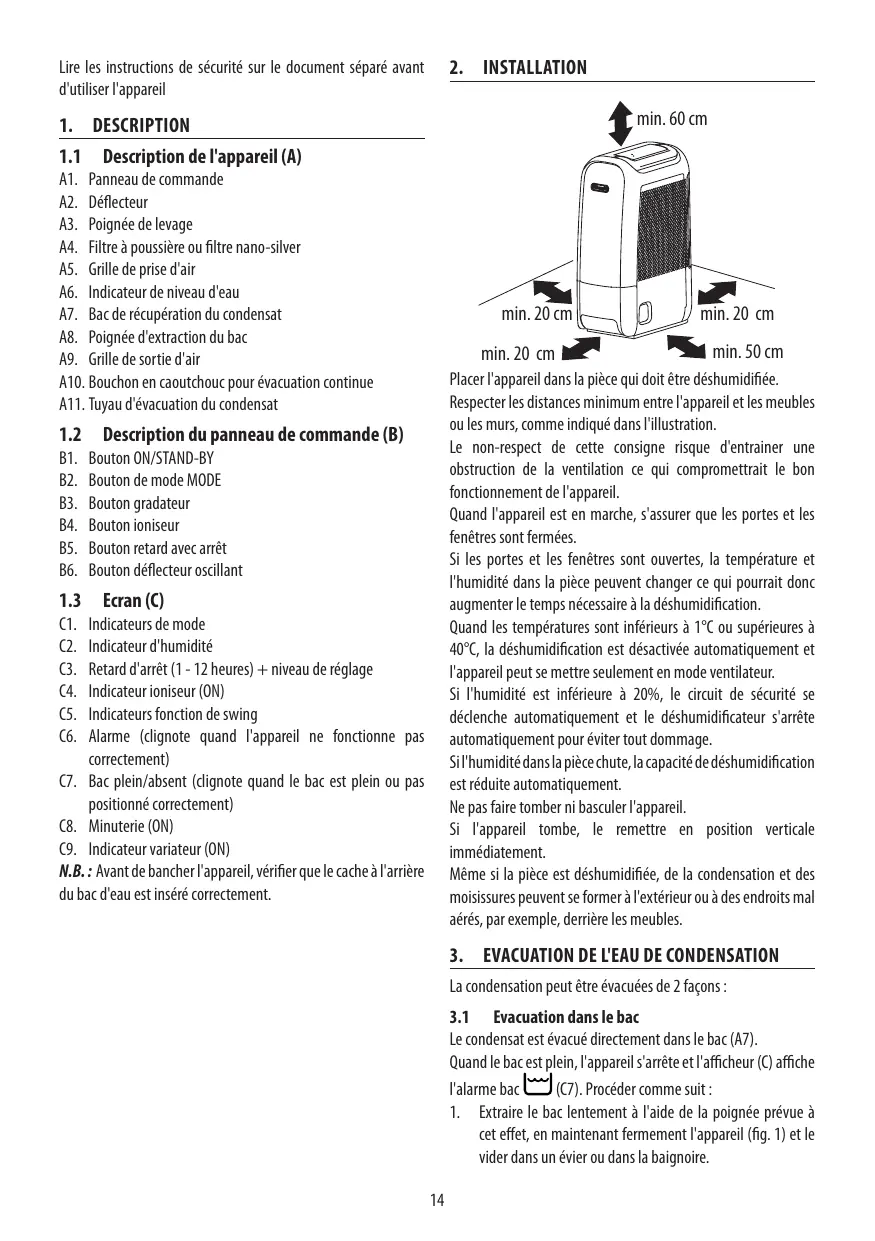 Placer l'appareil dans la pièce qui doi être déshumidifiée. Respecter es distances minimum entre l'appareil et les meubles ou les murs, comme indiqué dans l'llustration.