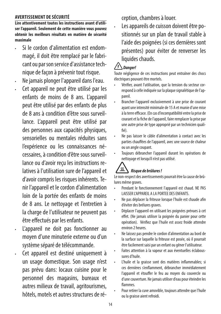 L'huile et la graisse sont des matières inflammables; si ces dernières s'enflamment, débrancher immédiatement l'appareil et étouffer le feu au moyen du couvercle ou d'une couverture. Ne jamais utiliser d'eau pour éteindre les flammes.