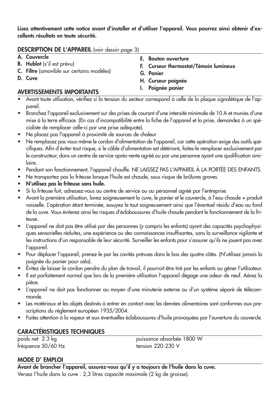+ Ne transportez pas la friteuse lorsque l'huile est chaude, sous risque de brülures graves.