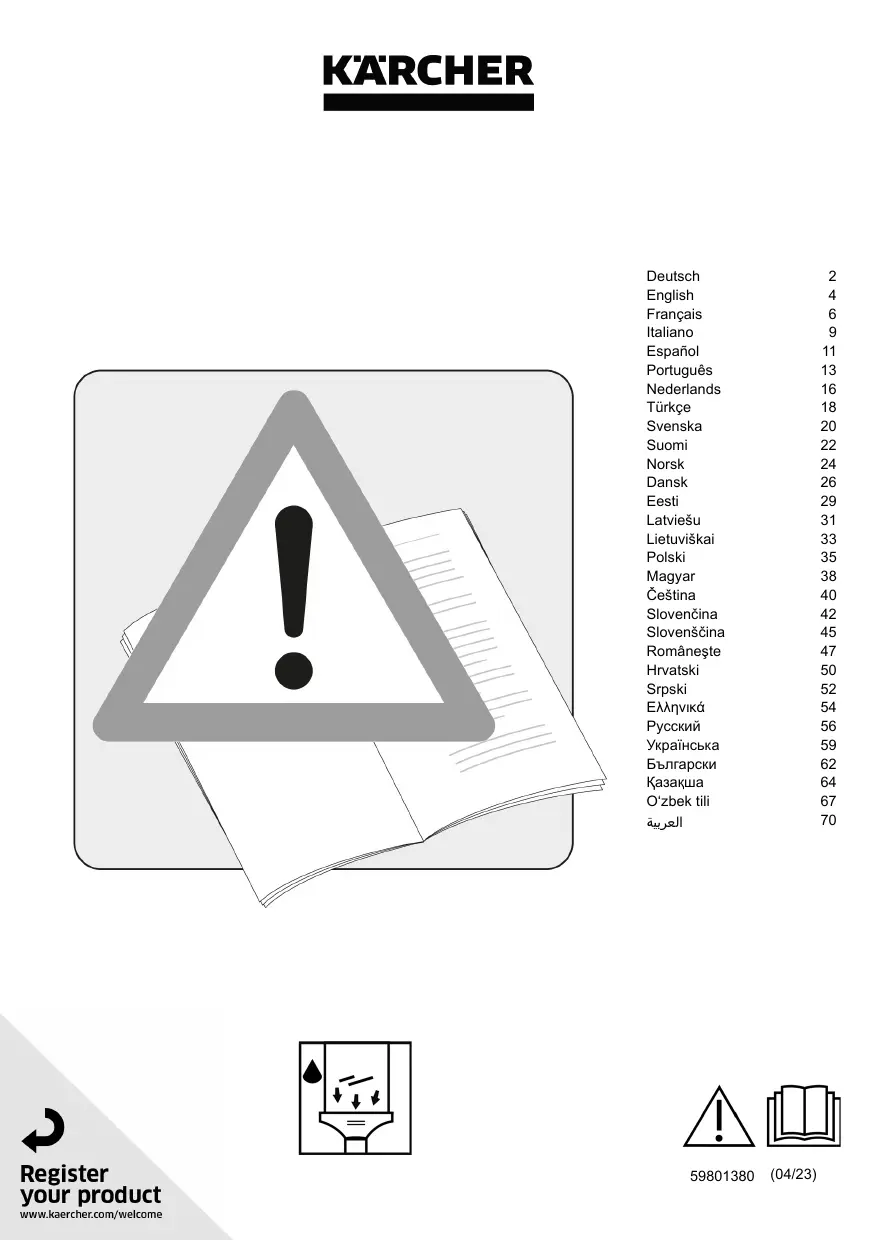 sible malfunctions on your device within the warranty period free of cost, provided that a material or manufac- ring defect is the cause. In a warranty case, please contact your dealer (with the purchase receipt) or the next authorised customer service site. (See overleaf for the address) Accessories and spare parts Only use original accessories and original spare parts. They ensure that the appliance will run fault-free and safely. Information on accessories and spare parts can be found at www.kaercher.com. Troubleshooting guide Malfunctions often have simple causes that you can remedy yourself using the following overview. When in doubt, or in the case of malfunctions not mentioned here, please contact your authorised Customer Service. As the battery pack ages, even if itis looked after, the battery capacity reduces such that the full run time will no longer be reached when fully charged. This does not indicate a defect. Error codes and error descriptions Display Error description [Error correction ET Battery temperature is 100 high or | Allow the device to cool down / heat up low. + Operate and store the appliance attemperatures usual for living areas. E2 (Suction turbine blocks due to too | Do not use the appliance to absorb larger quantities of flu- much fluid or solids having been ids from horizontal surfaces. labsorbed Do not use the appliance to absorb dust or solids + Empty the waste water tank when the MAX mark is reached at the latest. Only use suitable detergents, no spirits, no foam cleanser. Window cleaner concentrates from KARCHER are best suited for cleaning, E3 (Charging voltage too high. Only use the original charger enclosed or with a charger approved by KARCHER. E4 Battery voltage <3 V. e _ Intemal appliance error, please contact your dealer or au- thorised Customer Service. Lo Battery is discharged Charge the appliance using the original charger enclosed or with a charger approved by KÂRCHER. Consignes de sécurité Veuillez ire ces consignes de sécurité et  le manuel d'instructions original avant la première utilisation de l'appareil. Suivez ces instructions. Conservez ces deux documents pour une utilisation ultérieure ou pour le propriétaire suivant. + Avant la mise en service, prenez en compte le ma- nuel d'utilisation graphique de votre appareil et ces consignes de sécurité. + Outre les remarques dans ce manuel d'utilisation, vous devez prendre en compte les directives géné- rales de sécurité et les directives pour la prévention des accidents du législateur. + Ne laissez pas les matériaux d'emballage à la por- tée des enfants, il y a un risque d'asphyxie. Niveaux de danger À DANGER + Indique un danger immédiat qui peut entraîner de graves blessures corporelles ou la mort. À AVERTISSEMENT + Indique une situation potentiellement dangereuse qui peut entrainer de graves blessures corporelles ou la mort. À PRÉCAUTION + Indique une situation potentiellement dangereuse qui peut entrainer des blessures légères. ATTENTION + Indique une situation potentiellement dangereuse qui peut entrainer des dommages matériels. Remarques générales À AVERTISSEMENT » Les personnes dont les capacités physiques sensorielles ou mentales sont réduites ou qui manquent d'expérience ou de connais- sance peuvent utiliser l'appareil, si elles sont correcte- ment surveillées ou si elles ont été instruites sur l'utilisation sûre de l'appareil et comprennent les dan- gers qui en résultent. » Surveillez les enfants pour s'as- Surer qu'ils ne jouent pas avec l'appareil. + Les enfants peuvent utiliser l'appareil à partir de l'âge de 8 ans, s'ils ont été instruits par une personne compétente de son utilisation et des consignes de sécurité ou s'ils sont sur- veillés et s'ils ont compris les dangers pouvant en résul- ter. e Les enfants ne peuvent effectuer le nettoyage et l'entretien de l'appareil que sous surveillance. « Les en- fants ne sont pas autorisés à jouer avec l'appareil. Risque d'électrocution À DANGER « Ne touchez jamais aux fiches sec- teuret prises de courant avec les mains mouillées. e Ne touchez jamais aux contacts ou câbles. N'introduisez jamais d'objets conducteurs, par ex. tournevis ou simi- laire, dans la prise du chargeur de l'appareil. e N'expo- Sez pas l'accu à un rayonnement intense du soleil, à la chaleur ou au feu. e Ne dirigez pas le jet de pulvérisa- tion directement sur les équipements contenant des composants électriques, tels que l'espace intérieur de fours. À AVERTISSEMENT » Chargez l'appareil uniquement avec le chargeur d'origine fourni ou avec un chargeur autorisé par KARCHER. « Remplacez immé- diatement un chargeur endommagé avec son câble de 6 Français