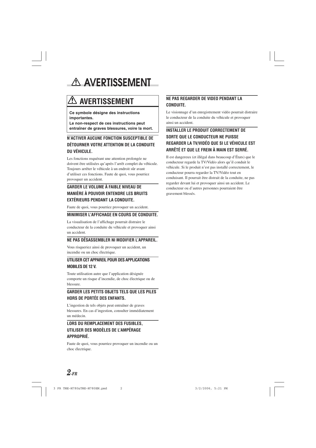 3/2/2006, 5:21 PM AVERTISSEMENT AVERTISSEMENT NE PAS REGARDER DE VIDEO PENDANT LA CONDUITE. Ce symbole désigne des instructions importantes. Le non-respect de ces instructions peut entraîner de graves blessures, voire la mort. Le visionnage d’un enregistrement vidéo pourrait distraire le conducteur de la conduite du véhicule et provoquer ainsi un accident.
