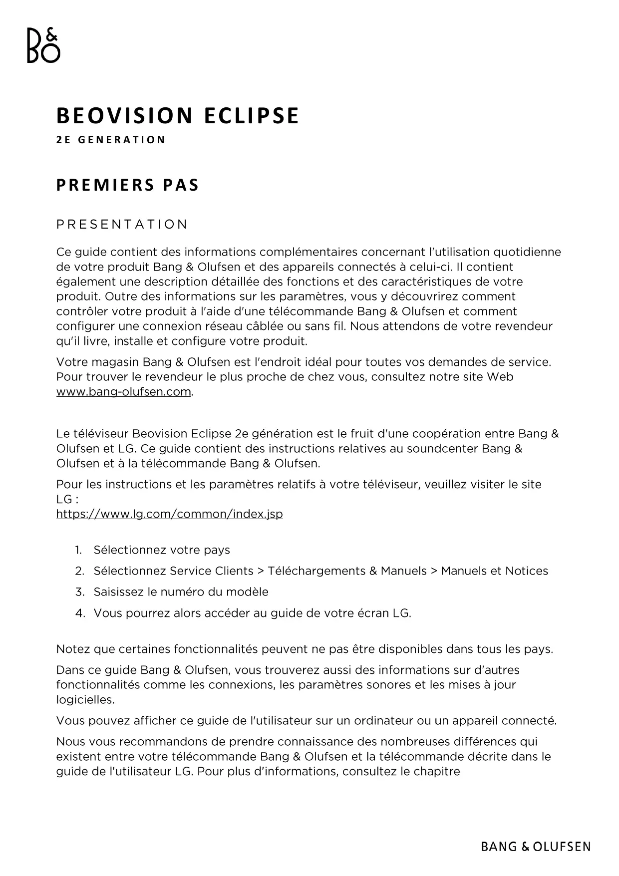BEOVISION ECLIPSE 2E GENERATION PREMIERS PAS PRESENTATION Ce guide contient des informations complémentaires concernant l'utilisation quotidienne de votre produit Bang & Olufsen et des appareils connectés à celui-ci. Il contient également une description détaillée des fonctions et des caractéristiques de votre produit. Outre des informations sur les paramètres, vous y découvrirez comment contrôler votre produit à l'aide d'une télécommande Bang & Olufsen et comment configurer une connexion réseau câblée ou sans fil. Nous attendons de votre revendeur qu'il livre, installe et configure votre produit. Votre magasin Bang & Olufsen est l'endroit idéal pour toutes vos demandes de service. Pour trouver le revendeur le plus proche de chez vous, consultez notre site Web www.bang-olufsen.com. Le téléviseur Beovision Eclipse 2e génération est le fruit d'une coopération entre Bang & Olufsen et LG. Ce guide contient des instructions relatives au soundcenter Bang & Olufsen et à la télécommande Bang & Olufsen. Pour les instructions et les paramètres relatifs à votre téléviseur, veuillez visiter le site LG: https://www.lg.com/common/index.jsp Sélectionnez votre pays Sélectionnez Service Clients > Téléchargements & Manuels > Manuels et Notices Saisissez le numéro du modèle BB & N Vous pourrez alors accéder au guide de votre écran LG. Notez que certaines fonctionnalités peuvent ne pas être disponibles dans tous les pays. Dans ce guide Bang & Olufsen, vous trouverez aussi des informations sur d'autres fonctionnalités comme les connexions, les paramètres sonores et les mises à jour logicielles. Vous pouvez afficher ce guide de l'utilisateur sur un ordinateur ou un appareil connecté. Nous vous recommandons de prendre connaissance des nombreuses différences qui existent entre votre télécommande Bang & Olufsen et la télécommande décrite dans le guide de l'utilisateur LG. Pour plus d'informations, consultez le chapitre BANG & OLUFSEN