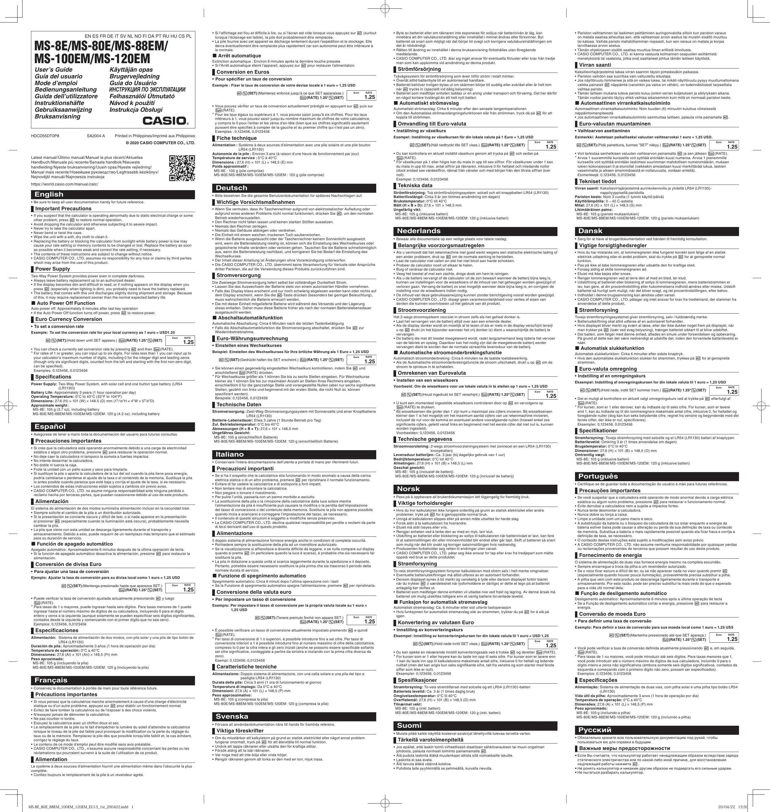 • Para tasas de 1 0 mayores, puede ingresar hasta seis digitos. Para tasas menares de 1 puede ingresar hasta el nümero méximo de digitos de su calculadora, incluyendo O para el digito entero y ceros a la izquierda (aunque solamente se pueden especificar sels digitos signiticantes, contados desde la izquierda y comenzando con el primer digito que no sea cero) Ejemplos: 0.128456, 0,0123456 HEspecificaciones Alimentacién: Sistema de alimentaciôn de dos modos, con pila Solar y una pila de tipo botôn de LRS4 (LR1180) Duracién de pila: Aproximadamente 3 años (1 hora de operaciôn por dia) Temperatura de operaciôn: 0°C a 40°C Dimensiones: 27,6 (Al) x 101 (An) x 148,5 (Pr) mm Peso aproximado: MS-8E: 105 g (incluyendo la pila) MS-80E/MS-88EM/MS-100EM/MS-120EM: 120 g (incluyendo la pila) Français + Gonservez la documentation à portée de main pour toute référence future [| Précautions importantes + Si vous pensez que la calculatrice marche anormalement à cause d'une charge d'élèctricité statique ou d'un autre problème, appuyez sur G pour établir un fonctionnement normal. + Evitez de faire tomber la calculatrice ou de l'exposer à des chocs violents. + N'essayez jamais de démonter la calculatrice. + Ne pas courber ni tordre. + Essuyez la calculatrice avec un chiffon doux et sec. + Le remplacement de la pile ou le fait d'empêcher la lumière du soleil d'atteindre la calculatrice lorsque le niveau de la pile est faible peut provoquer la modification ou la perte du réglage du taux ou de la mémoire. Remplacez la pile dès que possible lorsqu'elle faibli et, le cas échéant, corrigez le réglage du taux + Le contenu de ce mode d'emploi peut être modifié sans avis préalable. + CASIO COMPUTER CO, LTD, n'assume aucune responsabilité concemant les pertes ou les réclamations qui pourraient survenir à la suite de l'utilisation de ce produit. HaAlimentation Le système à deux sources d'alimentation fournit une alimentation même dans l'obscurité la plus. complète. + Confiez toujours le remplacement de la pile à un revendeur agréé. MS:8E_80E_ 88EM_100EM_120EM_EU5_1st_: 1 + Si l'affichage est flou et difficile à lire, ou si l'écran est vide lorsque vous appuyez sur Bd (surtout lorsque l'éclairage est faible), la pile doi probablement être remplacée. + La pli fournie avec cet appareil se décharge lentement durant l'expédition et le stockage. Elle devra éventuellement être remplacée plus rapidement car son autonomie peut être inférieure à la normale M Arrêt automatique Extinction automatique : Environ 6 minutes après la dernière touche pressée + Sil'Arrêt automatique éteint l'appareil, appuyez sur ( pour restaurer l'alimentation. HConversion en Euros + Pour spécifier un taux de conversion Exemple : Fixer e taux de conversion de votre devise locale à 1 euro G9 ŒD(SET) (Maintenez enfoncé jusqu'à ce que SET apparaisse.) que En (RATE) 1.25" Œ)(SET) 1.25 + Vous pouvez vérifier un taux de conversion actuellement préréglé en appuyant sur F3 puis sur (RATE)