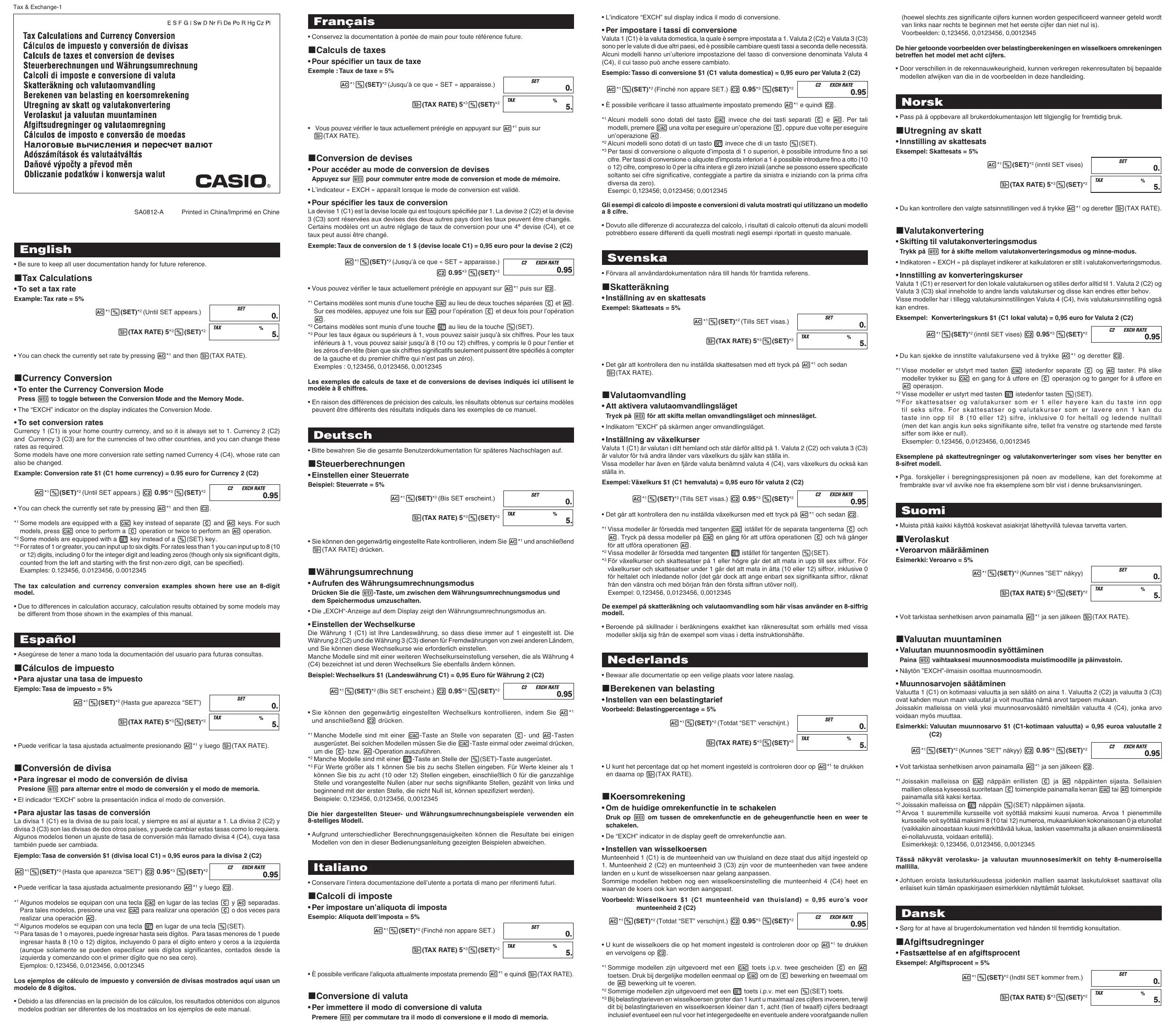 +_ Vous pouvez vérifier le taux actuellement prérégle en appuyant sur 3° puis sur (TAX RATE). + Pour accéder au mode de conversion de devises Appuyez sur (TE pour commuter entre mode de conversion et mode de mémoire. - L'indicateur « EXCH » apparaît lorsque le mode de conversion est validé. + Pour spécifier les taux de conversion La devise 1 (C1) estla devise locale qui est toujours spécifiée par 1. La devise 2 (C2) etla devise 8 (C3) sont réservées aux devises des deux autres pays dont les taux peuvent être changés. Certains modèles ont un autre réglage de taux de conversion pour une 4° devise (C4), et ce taux peut aussi être changé Exemple: Taux de conversion de 1 $ (devise locale C1) = 0,95 euro pour la devise 2 (C2) (SET: (Jusqu'à ce que « SET » apparaisse.)