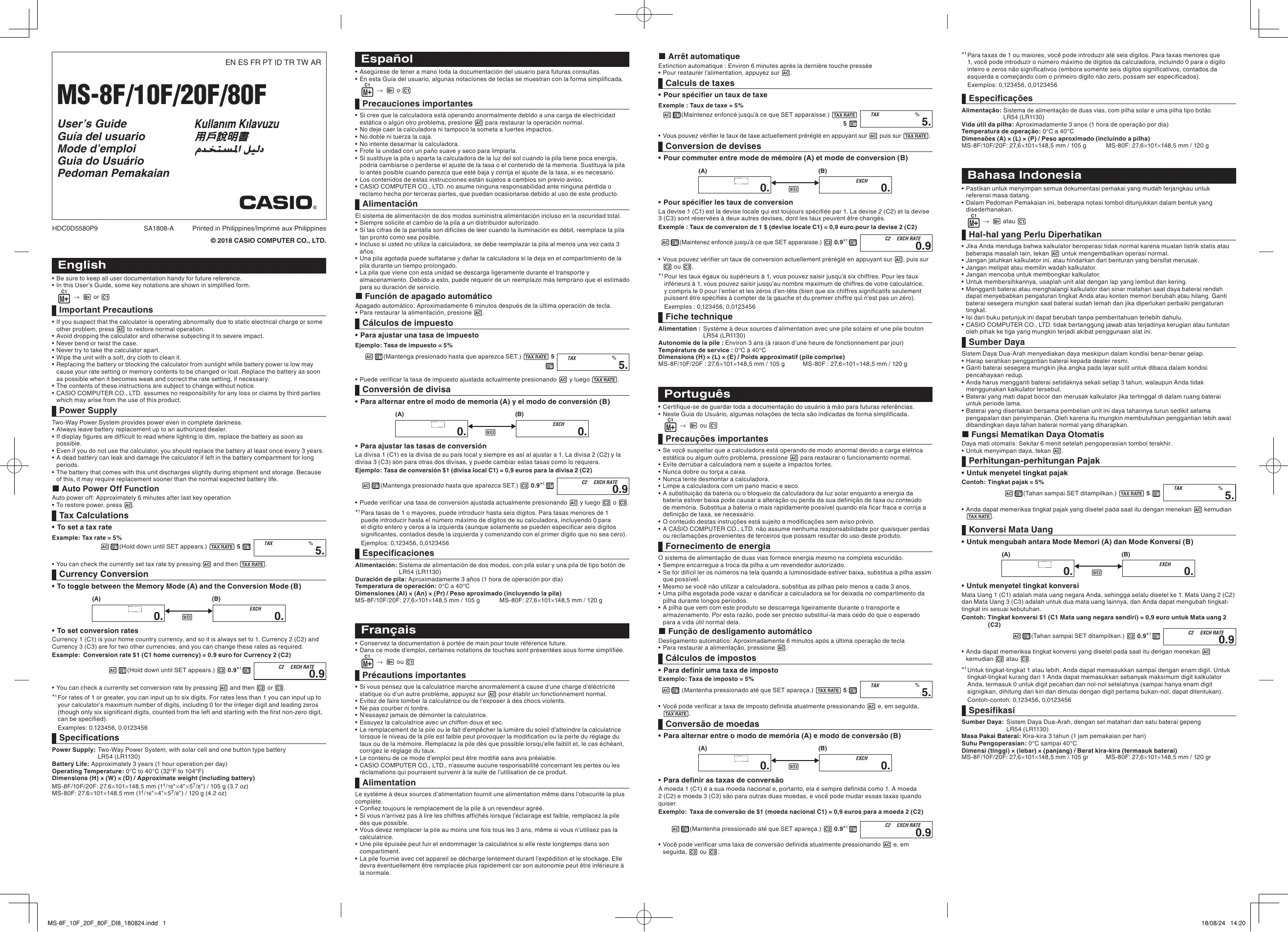 > Bu@ EPrécautions importantes + You can check a eurrentiy set conversion rate by pressing G3 and then €3 or € *‘For rates of 1 or greater, you can input up to six digits. For rates less than 1 you can input up to Your calculators maximum number of digjts, including 0 for the integer digit and leading zeros. {though on six significant digits, counted from the left and starting with the first non-zero digit, can be speciied). Examples: 0.123456, 0.0123456 ESpecifications Power Supply: Two-Way Power System, with solar cell and one button type battery LRS4 (LR1180) Battery Life: Approximately 3 years (1 hour operation per day) Operating Temperature: 0°C Lo 40°C (32°F 1 104°F) Dimensions (H) x (W) x (D)/ Approximate weight (including battery) MS-8F/OF/20F: 27.6x101x148.5 mm (11/18"x4"x87/8") / 105 g (8.7 02) MS-80F: 27.6x101x148.5 mm (11/18"x4"x57/8") / 120 g (4.2 02) MS-8F_10F_20F_80F_DIS_180824indd 1 + Si vous pensez que la calculatrice marche anormalement à cause d'une charge d'élèctricité Statique ou d'un autre problème, appuyez sur F9 pour établir un fonctionnement normal + Evitez de faire tomber la calculatrice ou de l'exposer à des chocs violents. + Ne pas courber ni tordre. + N'essayez jamais de démonter la calculatrice. + Essuyez la calculatrice avec un chiffon doux et sec. + Le remplacement de la pile ou le fait d'empêcher la lumière du soleil d'atteindre la calculatrice lorsque le niveau de la pile est faible peut provoquer la modification ou la perte du réglage du taux ou de la mémoire. Remplacez la pile dès que possible lorsqu'elle faibli et, le cas échéant, corrigez le réglage du taux + Le contenu de ce mode d'emploi peut être modifié sans avis préalable. + CASIO COMPUTER CO, LTD, n'assume aucune responsabilité concernant les pertes ou les réclamations qui pourraient survenir à la suite de l'utilisation de ce produit. HaAlimentation Le système à deux sources d'alimentation fournit une alimentation même dans l'obscurité la plus. complète. + Confiez toujours le remplacement de la pile à un revendeur agréé. + Si vous n'arrivez pas à lire les chiffres affichés lorsque l'éclairage est faible, remplacez la pile dès que possible. + Vous devez remplacer la pile au moins une fois tous les 8 ans, même si vous n'uti calculatrice. + Une pile épuisée peut fuir et endommager la calculatrice si elle reste longtemps dans son compartiment. + La pile fournie avec cet appareil se décharge lentement durant l'expédition et le stockage. Elle devra éventuellement être remplacée plus rapidement car son autonomie peut être inférieure à la normale. ez pas la M Arrêt automatique Extinction automatique : Environ 6 minutes après la dernière touche pressée + Pour restaurer l'alimentation, appuyez sur (3. Hcaicuis de taxes + Pour spécifier un taux de taxe Exemple : Taux de taxe = 5% ED(Maintenez enfoncé jusqu'à ce que SET apparaisse )