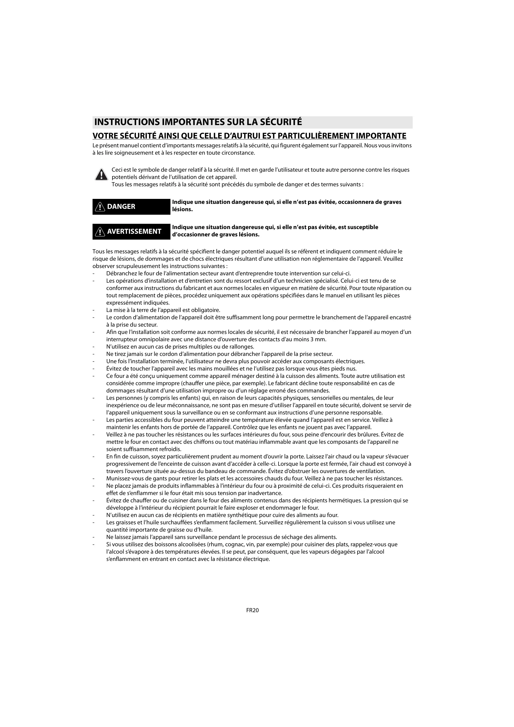 VOTRE SÉCURITÉ AINSI QUE CELLE D’AUTRUI EST PARTICULIÈREMENT IMPORTANTE Le présent manuel contient d’importants messages relatifs à la sécurité, qui figurent également sur l’appareil. Nous vous invitons à les lire soigneusement et à les respecter en toute circonstance. Ceci est le symbole de danger relatif à la sécurité. Il met en garde l’utilisateur et toute autre personne contre les risques potentiels dérivant de l’utilisation de cet appareil. Tous les messages relatifs à la sécurité sont précédés du symbole de danger et des termes suivants : DANGER Indique une situation dangereuse qui, si elle n’est pas évitée, occasionnera de graves lésions. AVERTISSEMENT Indique une situation dangereuse qui, si elle n’est pas évitée, est susceptible d’occasionner de graves lésions. Tous les messages relatifs à la sécurité spécifient le danger potentiel auquel ils se réfèrent et indiquent comment réduire le risque de lésions, de dommages et de chocs électriques résultant d’une utilisation non réglementaire de l’appareil. Veuillez observer scrupuleusement les instructions suivantes : Débranchez le four de l’alimentation secteur avant d’entreprendre toute intervention sur celui-ci. Les opérations d’installation et d’entretien sont du ressort exclusif d’un technicien spécialisé. Celui-ci est tenu de se conformer aux instructions du fabricant et aux normes locales en vigueur en matière de sécurité. Pour toute réparation ou tout remplacement de pièces, procédez uniquement aux opérations spécifiées dans le manuel en utilisant les pièces expressément indiquées. La mise à la terre de l’appareil est obligatoire. Le cordon d’alimentation de l’appareil doit être suffisamment long pour permettre le branchement de l’appareil encastré à la prise du secteur. Afin que l’installation soit conforme aux normes locales de sécurité, il est nécessaire de brancher l’appareil au moyen d’un interrupteur omnipolaire avec une distance d’ouverture des contacts d’au moins 3 mm. N’utilisez en aucun cas de prises multiples ou de rallonges. Ne tirez jamais sur le cordon d’alimentation pour débrancher l’appareil de la prise secteur. Une fois l’installation terminée, l’utilisateur ne devra plus pouvoir accéder aux composants électriques. Évitez de toucher l’appareil avec les mains mouillées et ne l’utilisez pas lorsque vous êtes pieds nus. Ce four a été conçu uniquement comme appareil ménager destiné à la cuisson des aliments. Toute autre utilisation est considérée comme impropre (chauffer une pièce, par exemple). Le fabricant décline toute responsabilité en cas de dommages résultant d’une utilisation impropre ou d’un réglage erroné des commandes. Les personnes (y compris les enfants) qui, en raison de leurs capacités physiques, sensorielles ou mentales, de leur inexpérience ou de leur méconnaissance, ne sont pas en mesure d’utiliser l’appareil en toute sécurité, doivent se servir de l’appareil uniquement sous la surveillance ou en se conformant aux instructions d’une personne responsable. Les parties accessibles du four peuvent atteindre une température élevée quand l’appareil est en service. Veillez à maintenir les enfants hors de portée de l’appareil. Contrôlez que les enfants ne jouent pas avec l’appareil. Veillez à ne pas toucher les résistances ou les surfaces intérieures du four, sous peine d’encourir des brûlures. Évitez de mettre le four en contact avec des chiffons ou tout matériau inflammable avant que les composants de l’appareil ne soient suffisamment refroidis. En fin de cuisson, soyez particulièrement prudent au moment d’ouvrir la porte. Laissez l’air chaud ou la vapeur s’évacuer progressivement de l’enceinte de cuisson avant d’accéder à celle-ci. Lorsque la porte est fermée, l’air chaud est convoyé à travers l’ouverture située au-dessus du bandeau de commande. Évitez d’obstruer les ouvertures de ventilation. Munissez-vous de gants pour retirer les plats et les accessoires chauds du four. Veillez à ne pas toucher les résistances. Ne placez jamais de produits inflammables à l’intérieur du four ou à proximité de celui-ci. Ces produits risqueraient en effet de s’enflammer si le four était mis sous tension par inadvertance. Évitez de chauffer ou de cuisiner dans le four des aliments contenus dans des récipients hermétiques. La pression qui se développe à l’intérieur du récipient pourrait le faire exploser et endommager le four. N’utilisez en aucun cas de récipients en matière synthétique pour cuire des aliments au four. Les graisses et l’huile surchauffées s’enflamment facilement. Surveillez régulièrement la cuisson si vous utilisez une quantité importante de graisse ou d’huile. Ne laissez jamais l’appareil sans surveillance pendant le processus de séchage des aliments. Si vous utilisez des boissons alcoolisées (rhum, cognac, vin, par exemple) pour cuisiner des plats, rappelez-vous que l’alcool s’évapore à des températures élevées. Il se peut, par conséquent, que les vapeurs dégagées par l’alcool s’enflamment en entrant en contact avec la résistance électrique. FR20 Mise au rebut des appareils ménagers usagés