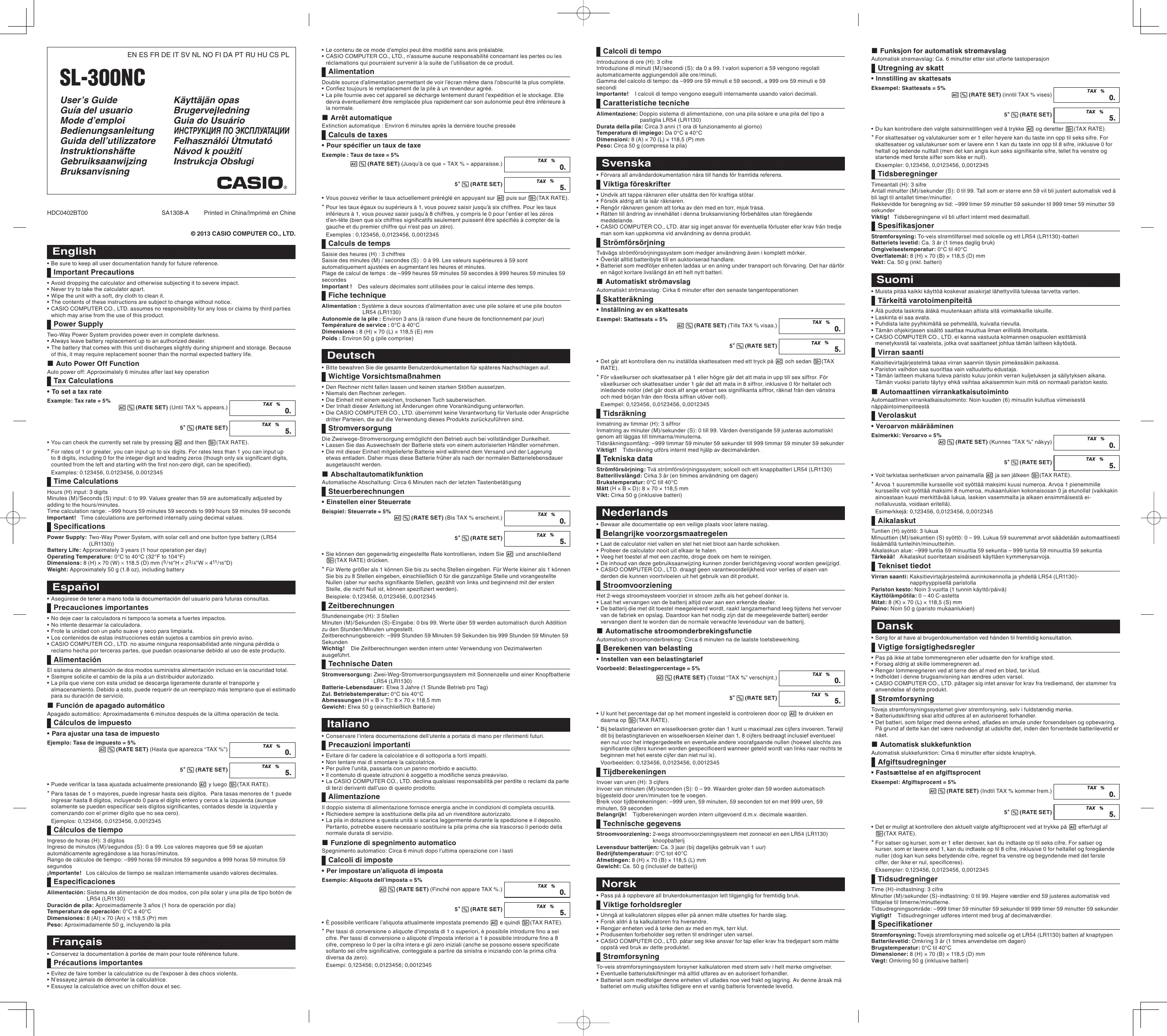 Retrouvez gratuitement la notice de l'appareil SL-300NC CASIO au format PDF.