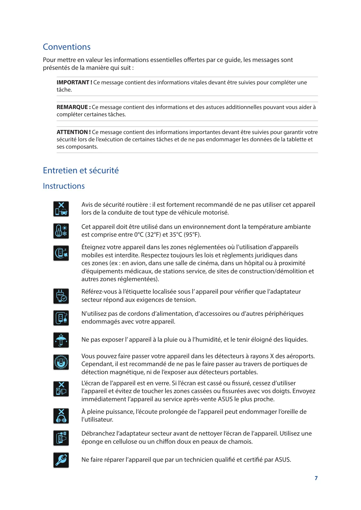 Entretien et sécurité Instructions Avis de sécurité routière : il est fortement recommandé de ne pas utiliser cet appareil lors de la conduite de tout type de véhicule motorisé. Cet appareil doit être utilisé dans un environnement dont la température ambiante est comprise entre 0°C (32°F) et 35°C (95°F). Éteignez votre appareil dans les zones réglementées où l’utilisation d’appareils mobiles est interdite. Respectez toujours les lois et règlements juridiques dans ces zones (ex : en avion, dans une salle de cinéma, dans un hôpital ou à proximité d’équipements médicaux, de stations service, de sites de construction/démolition et autres zones réglementées). Référez-vous à l’étiquette localisée sous l’ appareil pour vérifier que l’adaptateur secteur répond aux exigences de tension. N’utilisez pas de cordons d’alimentation, d’accessoires ou d’autres périphériques endommagés avec votre appareil. Ne pas exposer l’ appareil à la pluie ou à l’humidité, et le tenir éloigné des liquides. Vous pouvez faire passer votre appareil dans les détecteurs à rayons X des aéroports. Cependant, il est recommandé de ne pas le faire passer au travers de portiques de détection magnétique, ni de l’exposer aux détecteurs portables. L’écran de l’appareil est en verre. Si l’écran est cassé ou fissuré, cessez d’utiliser l’appareil et évitez de toucher les zones cassées ou fissurées avec vos doigts. Envoyez immédiatement l’appareil au service après-vente ASUS le plus proche. À pleine puissance, l’écoute prolongée de l’appareil peut endommager l’oreille de l’utilisateur. Débranchez l’adaptateur secteur avant de nettoyer l’écran de l’appareil. Utilisez une éponge en cellulose ou un chiffon doux en peaux de chamois. Ne faire réparer l’appareil que par un technicien qualifié et certifié par ASUS. 7