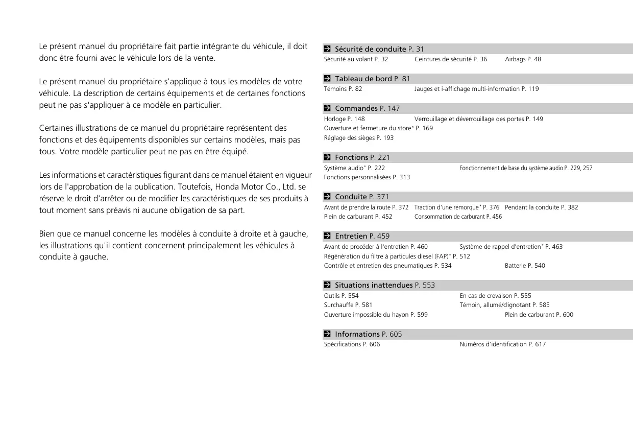 Le présent manuel du propriétaire fait partie intégrante du véhicule, il doit donc être fourni avec le véhicule lors de la vente. Le présent manuel du propriétaire s'applique à tous les modèles de votre véhicule. La description de certains équipements et de certaines fonctions peut ne pas s'appliquer à ce modèle en particulier. Certaines illustrations de ce manuel du propriétaire représentent des fonctions et des équipements disponibles sur certains modèles, mais pas tous. Votre modèle particulier peut ne pas en être équipé. Les informations et caractéristiques figurant dans ce manuel étaient en vigueur lors de l'approbation de la publication. Toutefois, Honda Motor Co, Ltd. se réserve le droit d'arrêter ou de modifier les caractéristiques de ses produits à tout moment sans préavis ni aucune obligation de sa part. Bien que ce manuel concerne les modèles à conduite à droite et à gauche, les illustrations qu'il contient concernent principalement les véhicules à conduite à gauche. Sécurité de conduite P. 31 Sécurité au volant P. 32 Tableau de bord P. 81 Témoins P. 82 Commandes P. 147 Horloge P. 148 Ceintures de sécurité P.36 Airbags P. 48 Jauges et affichage mult-information P. 119 Verrouillage et déverrouillage des portes P. 149 Ouverture et fermeture du store” P. 169 Réglage des sièges P. 193 Fonctions P. 221 Système audio" P. 222 Fonctions personnalisées P. 313 Conduite P. 371 ‘Avant de prendre la route P. 372 Plein de carburant P. 452 Entretien P. 459 Fonctionnement de base du système audio P. 229, 257 Traction d'une remorque” P. 376. Pendant la conduite P. 382 Consommation de carburant P. 456 Avant de procéder à l'entretien P. 460 Système de rappel d'entretien” P. 463 Régénération du filtre à particules diesel FAP)" P. 512 Contre et entretien des pneumatiques P. 534 Batterie P. 540 Situations inattendues P. 553 Outis P. 554 En cas de crevaison P. 555 Surchauffe P. 581 Témoin, allumé/clignotant P. 585 Ouverture impossible du hayon P. 599 Plein de carburant P. 600 informations P. 605 Spécifications P. 606 Numéros d'identification P. 617