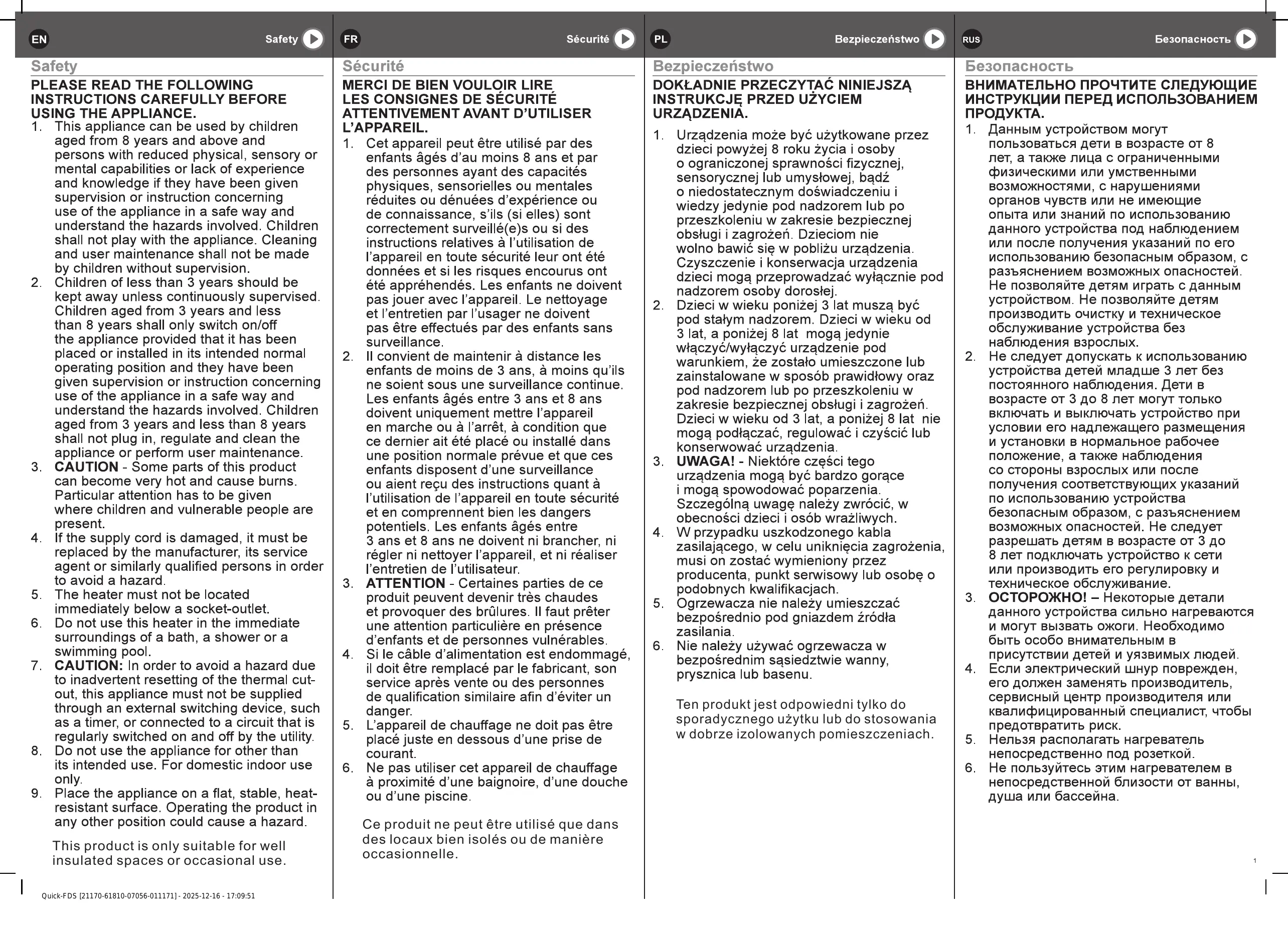 overheating, do not cover the heater. Do not immerse the cord, plug or any part ofthe appliance in water or any other liquid Conforms to all relevant European Directives. This product complies with conformity requirements of the applicable UK Regulations. Class | product, must be connected to earth Waste electrical products should not be disposed of with household waste. Please recycle where facilities exist. Check with your Local Authority or local store for recycling advice. 1DIPSR CO Manufacturing date code; year of manufacturing (20yy) and week of manufacturing (Wxx) IMPORTANT - RETAIN THIS INFORMATION FOR FUTURE REFERENCE: READ CAREFULLY Quick-FDS [21170-61810-07056-011171] - 2025-12-16 - 17:09:51 MISE EN GARDE : Pour éviter une surchauffe, ne pas couvrir l'appareil de chauffage. Ne mettez jamais le câble, la prise mâle ou toute autre partie de l'appareil dans l'eau, ni dans aucun autre liquide Conforme à toutes les directives européennes pertinentes Classe I, le produit doit être connecté à la terre Les déchets électriques ne doivent pas être jetés avec les déchets ménagers. Veuillez les recycler dans les centres appropriés. Contactez les autorités locales ou le détaillant pour toute question sur le recyclage. {OR ® ©