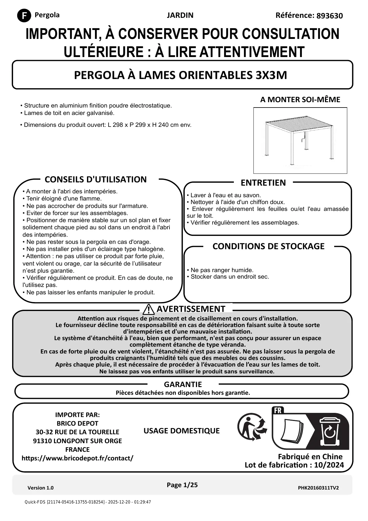 Pergola en aluminium lames orientables - Pergola BRICO DEPOT - Notice d'utilisation et mode d'emploi gratuit