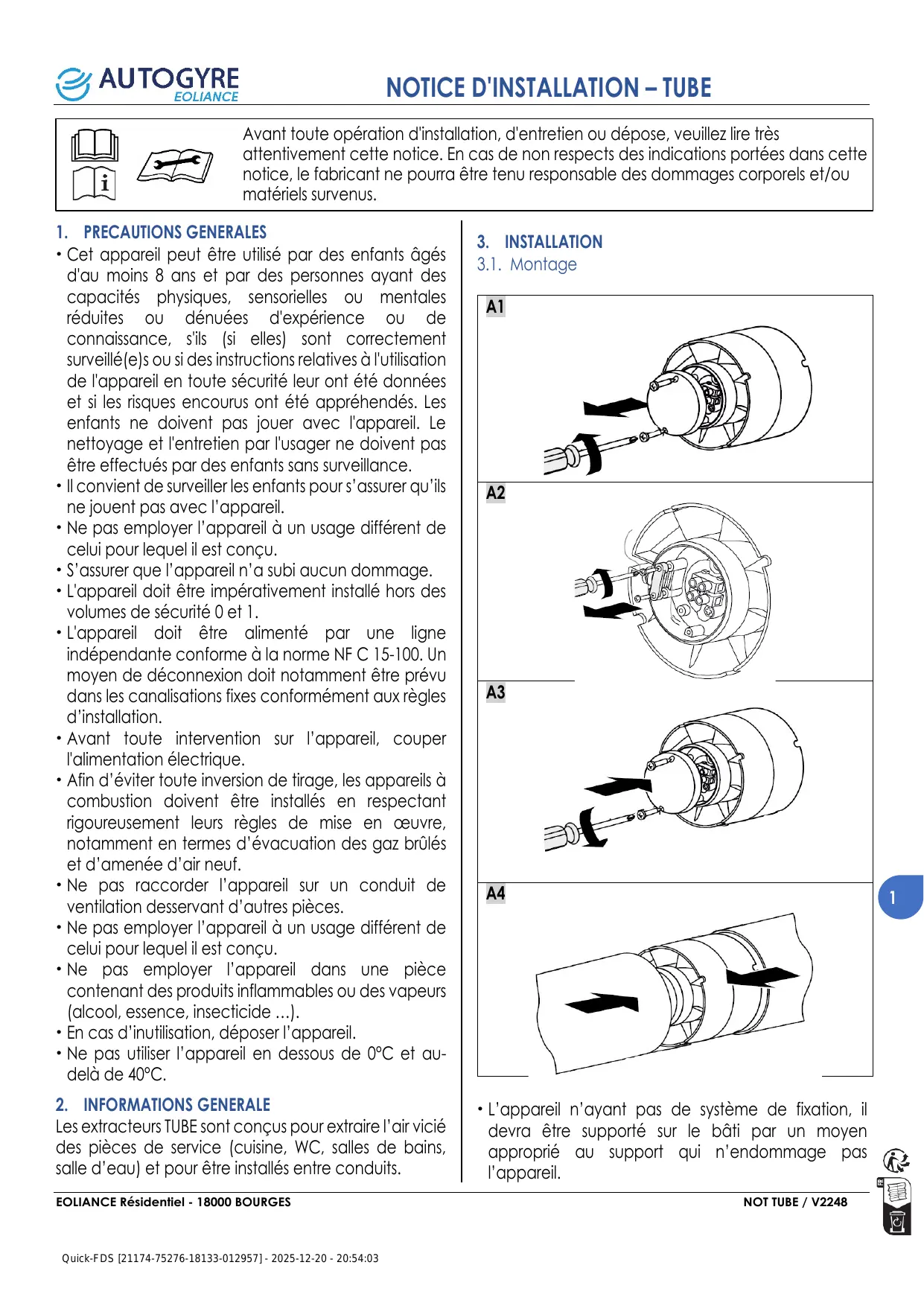 L'extracteur TUBE AUTOGYRE est principalement conçu pour une utilisation intérieure. Une utilisation extérieure peut affecter sa performance et sa durabilité.