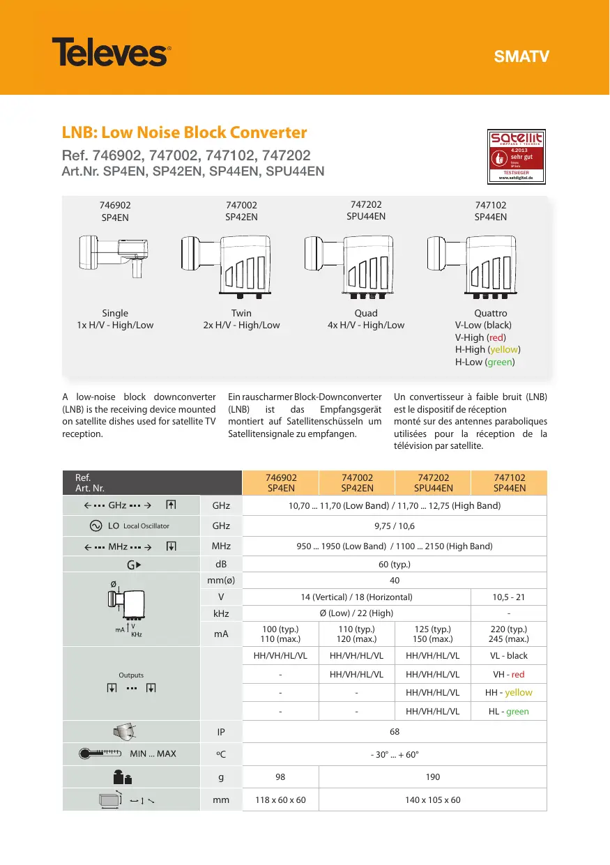 Téléchargez la notice de votre LNB au format PDF gratuitement ! Retrouvez votre notice 746902 - 747002 - 747102 - 747202 - TELEVES et reprennez votre appareil électronique en main. Sur cette page sont publiés tous les documents nécessaires à l'utilisation de votre appareil 746902 - 747002 - 747102 - 747202 de la marque TELEVES.