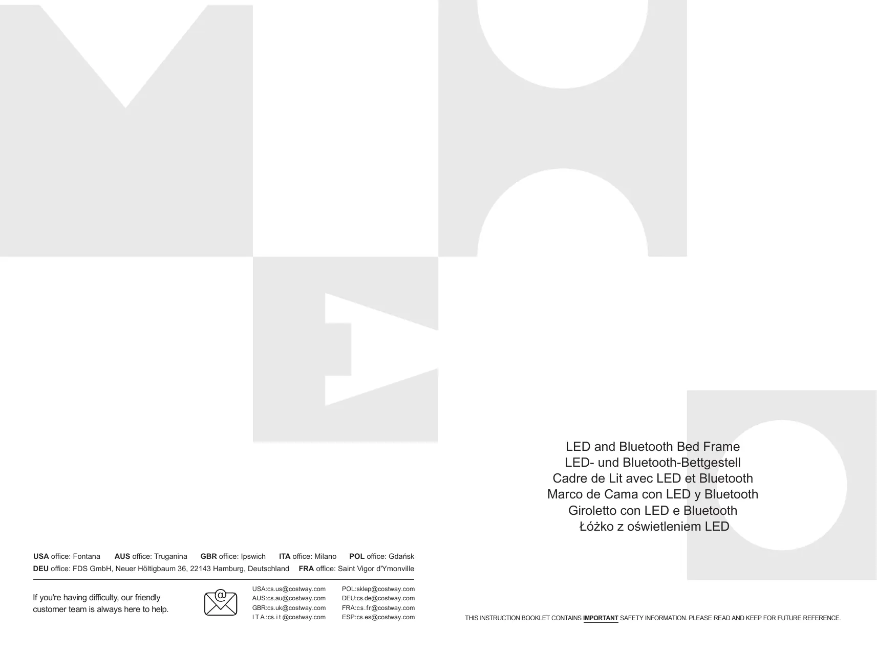 Retrouvez gratuitement la notice de l'appareil Cadre de Lit Double 140x200cm avec Sommier, Lit avec Éclairage LED COSTWAY au format PDF.