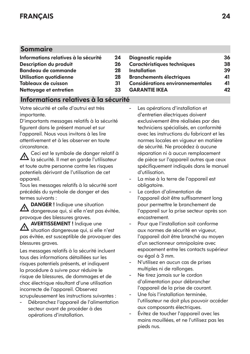 (*) Voir la notice d’emploi et d’entretien et les conditions d’application de la garantie contractuelle Garantie contractuelle IKEA PRIX : rien à payer en sus. DUREE : 5 (cinq) ans. POINT DE DEPART : à compter de la date d’achat chez IKEA. RÉPARATION DE L’APPAREIL : • remplacement des pièces, main-d’oeuvre, déplacement, transport des pièces ou de l’appareil : oui • garantie des pièces remplacées : non • délai d’intervention : fonction du type de réparation et porté à la connaissance de l’acheteur avant intervention. REMPLACEMENT OU REMBOURSEMENT DE L’APPAREIL (en cas d’impossibilité de réparation reconnue par le vendeur et le constructeur) : oui Pour mettre en oeuvre le service aprèsvente en cas de panne couverte par la garantie contractuelle, ou pour obtenir des informations techniques pour la mise en service ou le bon fonctionnement de l’appareil, contacter IKEA au numéro de téléphone respectif, suivant le pays, indiqué à la fin de cette notice et correspondant à votre appareil. Conservez votre preuve d’achat avec le document de garantie, ils vous seront nécessaires pour la mise en oeuvre de la garantie. CONDITIONS DE GARANTIE CONTRACTUELLE IKEA Quelle est la durée de validité de la garantie ? La présente garantie est valable cinq (5) ans à compter de la date d’achat chez IKEA d’un appareil électroménager de l’assortiment cuisines, à l’exception des appareils LAGAN qui sont garantis pour une durée de deux (2) ans.