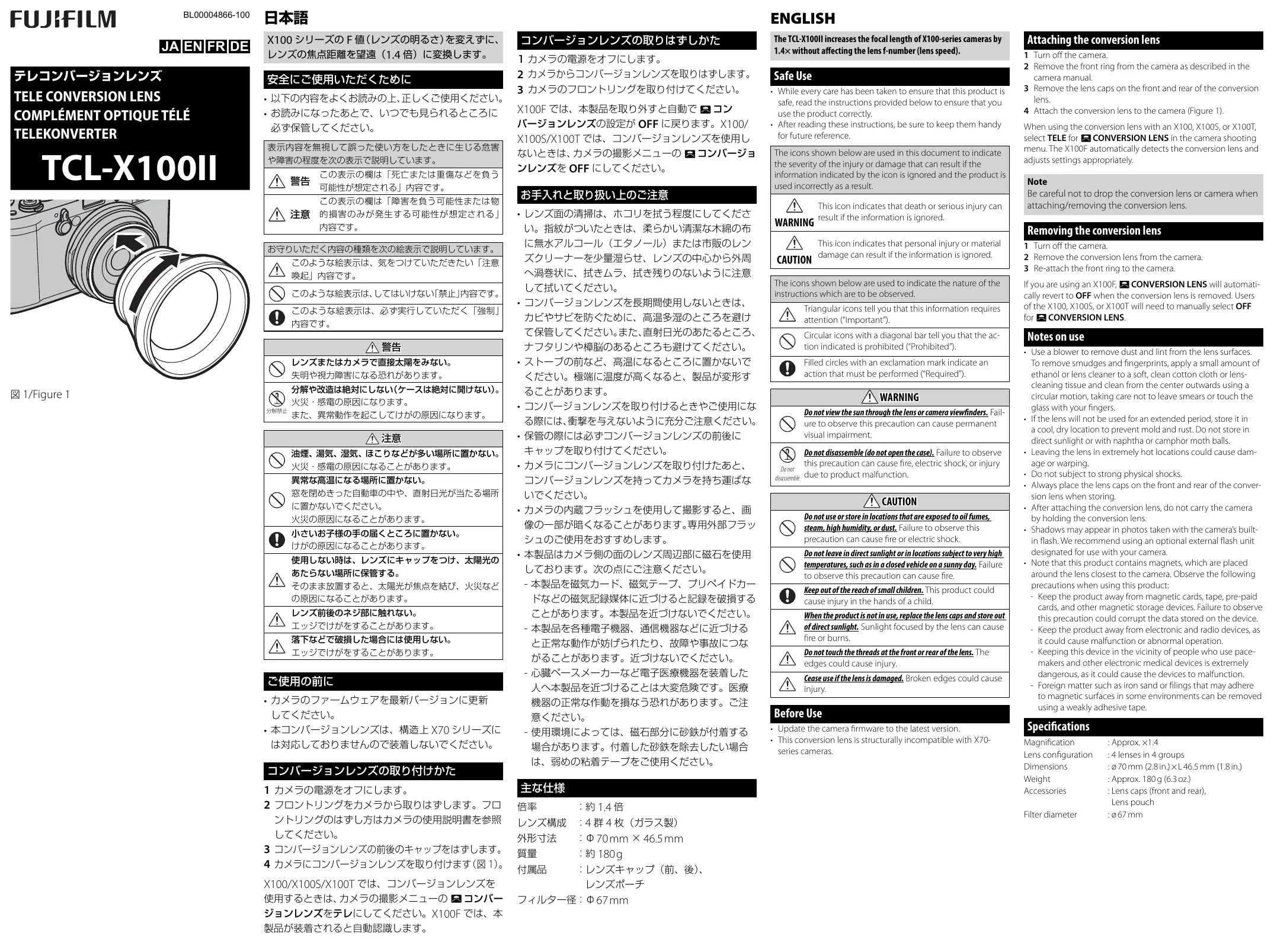 Téléchargez la notice de votre Accessoire photo au format PDF gratuitement ! Retrouvez votre notice TCLX100II - FUJIFILM et reprennez votre appareil électronique en main. Sur cette page sont publiés tous les documents nécessaires à l'utilisation de votre appareil TCLX100II de la marque FUJIFILM.