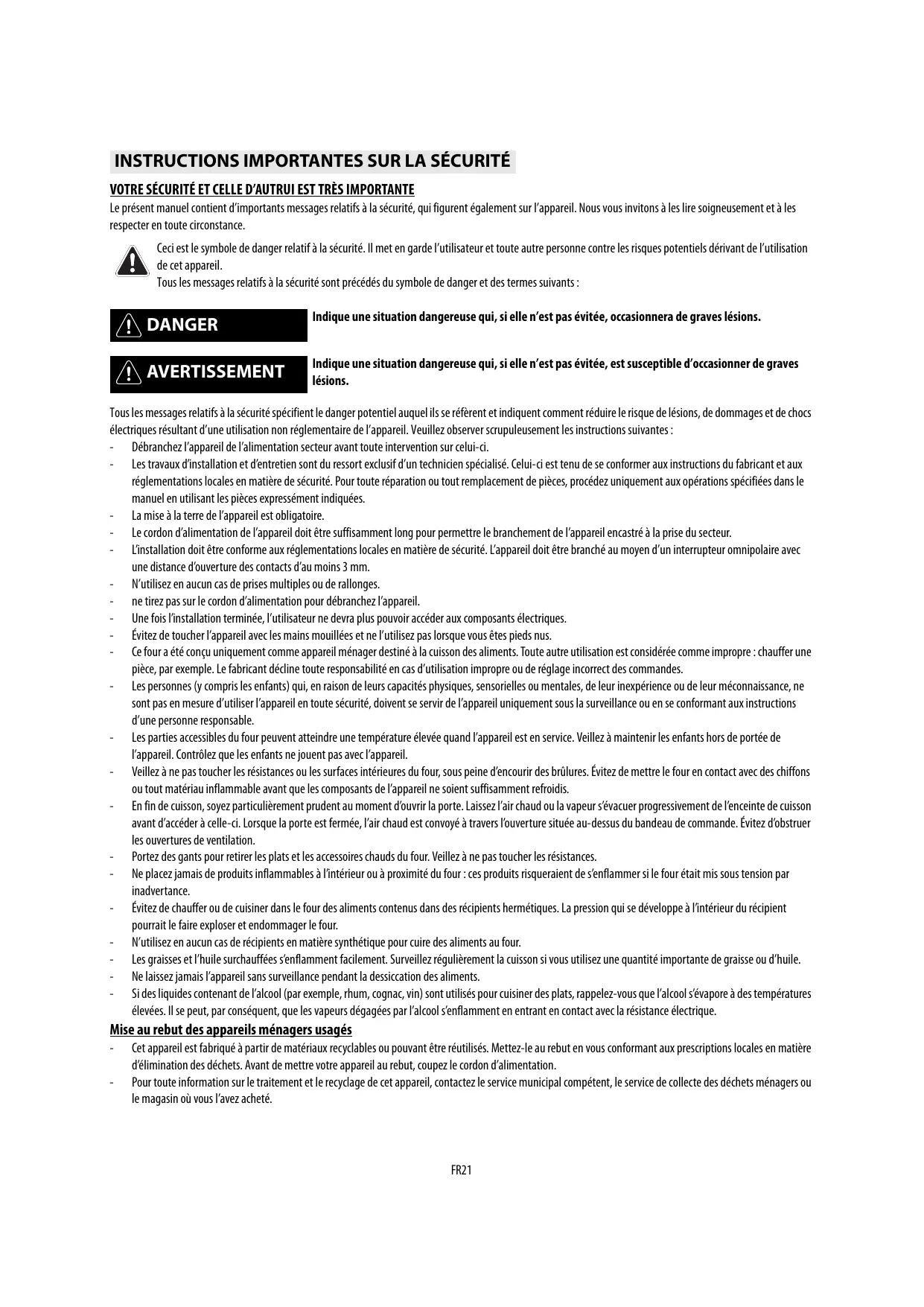 VOTRE SÉCURITÉ ET CELLE D’AUTRUI EST TRÈS IMPORTANTE Le présent manuel contient d’importants messages relatifs à la sécurité, qui figurent également sur l’appareil. Nous vous invitons à les lire soigneusement et à les respecter en toute circonstance. Ceci est le symbole de danger relatif à la sécurité. Il met en garde l’utilisateur et toute autre personne contre les risques potentiels dérivant de l’utilisation de cet appareil. Tous les messages relatifs à la sécurité sont précédés du symbole de danger et des termes suivants : DANGER Indique une situation dangereuse qui, si elle n’est pas évitée, occasionnera de graves lésions. AVERTISSEMENT Indique une situation dangereuse qui, si elle n’est pas évitée, est susceptible d’occasionner de graves lésions. Tous les messages relatifs à la sécurité spécifient le danger potentiel auquel ils se réfèrent et indiquent comment réduire le risque de lésions, de dommages et de chocs électriques résultant d’une utilisation non réglementaire de l’appareil. Veuillez observer scrupuleusement les instructions suivantes : - Débranchez l’appareil de l’alimentation secteur avant toute intervention sur celui-ci. - Les travaux d’installation et d’entretien sont du ressort exclusif d’un technicien spécialisé. Celui-ci est tenu de se conformer aux instructions du fabricant et aux réglementations locales en matière de sécurité. Pour toute réparation ou tout remplacement de pièces, procédez uniquement aux opérations spécifiées dans le manuel en utilisant les pièces expressément indiquées. - La mise à la terre de l’appareil est obligatoire. - Le cordon d’alimentation de l’appareil doit être suffisamment long pour permettre le branchement de l’appareil encastré à la prise du secteur. - L’installation doit être conforme aux réglementations locales en matière de sécurité. L’appareil doit être branché au moyen d’un interrupteur omnipolaire avec une distance d’ouverture des contacts d’au moins 3 mm. - N’utilisez en aucun cas de prises multiples ou de rallonges. - ne tirez pas sur le cordon d’alimentation pour débranchez l’appareil. - Une fois l’installation terminée, l’utilisateur ne devra plus pouvoir accéder aux composants électriques. - Évitez de toucher l’appareil avec les mains mouillées et ne l’utilisez pas lorsque vous êtes pieds nus. - Ce four a été conçu uniquement comme appareil ménager destiné à la cuisson des aliments. Toute autre utilisation est considérée comme impropre : chauffer une pièce, par exemple. Le fabricant décline toute responsabilité en cas d’utilisation impropre ou de réglage incorrect des commandes. - Les personnes (y compris les enfants) qui, en raison de leurs capacités physiques, sensorielles ou mentales, de leur inexpérience ou de leur méconnaissance, ne sont pas en mesure d’utiliser l’appareil en toute sécurité, doivent se servir de l’appareil uniquement sous la surveillance ou en se conformant aux instructions d’une personne responsable. - Les parties accessibles du four peuvent atteindre une température élevée quand l’appareil est en service. Veillez à maintenir les enfants hors de portée de l’appareil. Contrôlez que les enfants ne jouent pas avec l’appareil. - Veillez à ne pas toucher les résistances ou les surfaces intérieures du four, sous peine d’encourir des brûlures. Évitez de mettre le four en contact avec des chiffons ou tout matériau inflammable avant que les composants de l’appareil ne soient suffisamment refroidis. - En fin de cuisson, soyez particulièrement prudent au moment d’ouvrir la porte. Laissez l’air chaud ou la vapeur s’évacuer progressivement de l’enceinte de cuisson avant d’accéder à celle-ci. Lorsque la porte est fermée, l’air chaud est convoyé à travers l’ouverture située au-dessus du bandeau de commande. Évitez d’obstruer les ouvertures de ventilation. - Portez des gants pour retirer les plats et les accessoires chauds du four. Veillez à ne pas toucher les résistances. - Ne placez jamais de produits inflammables à l’intérieur ou à proximité du four : ces produits risqueraient de s’enflammer si le four était mis sous tension par inadvertance. - Évitez de chauffer ou de cuisiner dans le four des aliments contenus dans des récipients hermétiques. La pression qui se développe à l’intérieur du récipient pourrait le faire exploser et endommager le four. - N’utilisez en aucun cas de récipients en matière synthétique pour cuire des aliments au four. - Les graisses et l’huile surchauffées s’enflamment facilement. Surveillez régulièrement la cuisson si vous utilisez une quantité importante de graisse ou d’huile. - Ne laissez jamais l’appareil sans surveillance pendant la dessiccation des aliments. - Si des liquides contenant de l’alcool (par exemple, rhum, cognac, vin) sont utilisés pour cuisiner des plats, rappelez-vous que l’alcool s’évapore à des températures élevées. Il se peut, par conséquent, que les vapeurs dégagées par l’alcool s’enflamment en entrant en contact avec la résistance électrique. Mise au rebut des appareils ménagers usagés