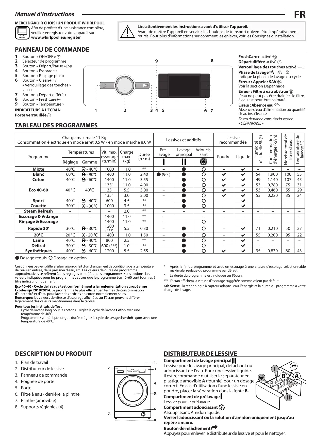 FFBD11489BVFR - Lave-linge hublot WHIRLPOOL - Notice d'utilisation et mode d'emploi gratuit