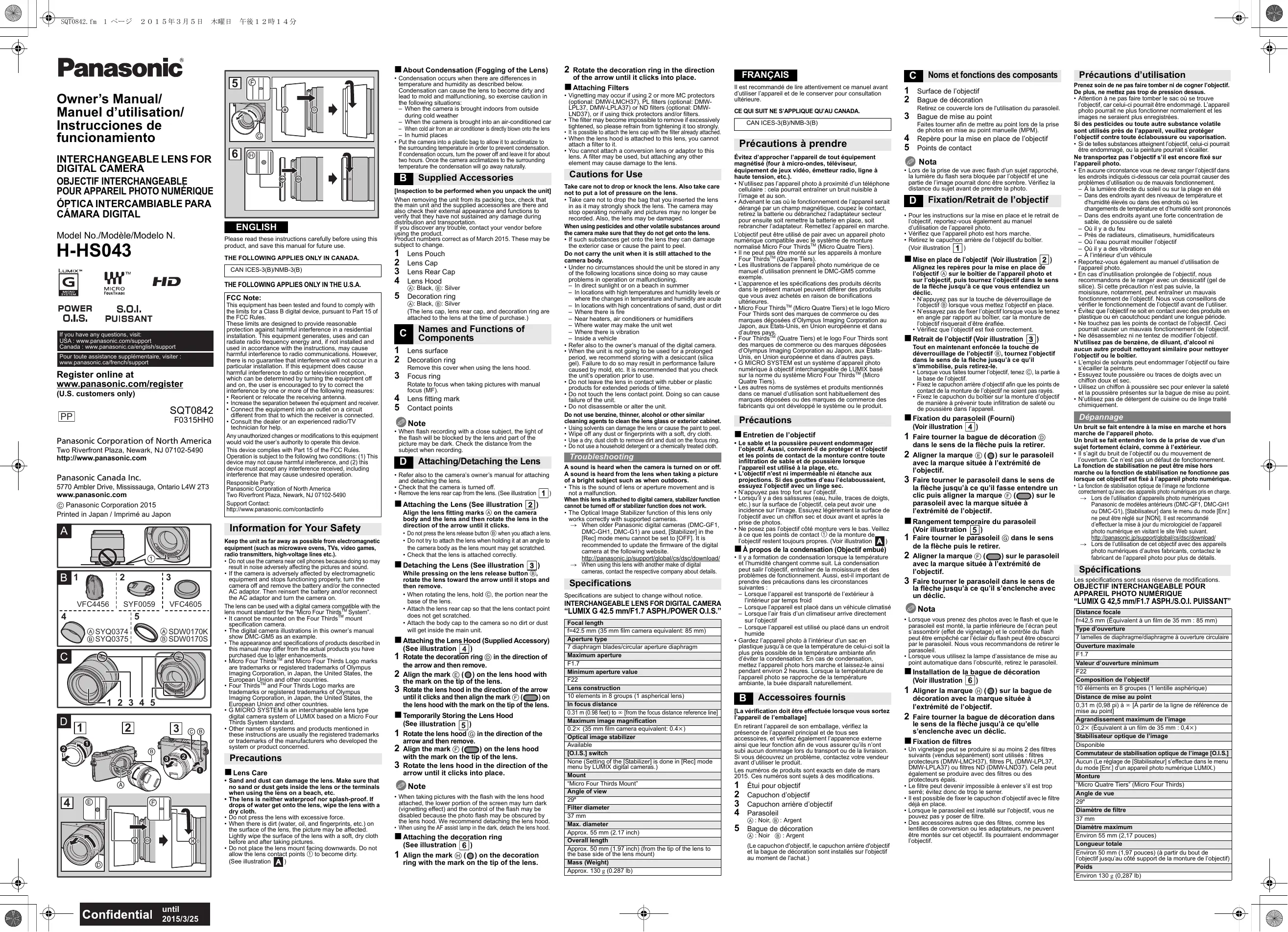 HHS043EK - Objectif photo PANASONIC - Notice d'utilisation et mode d'emploi gratuit
