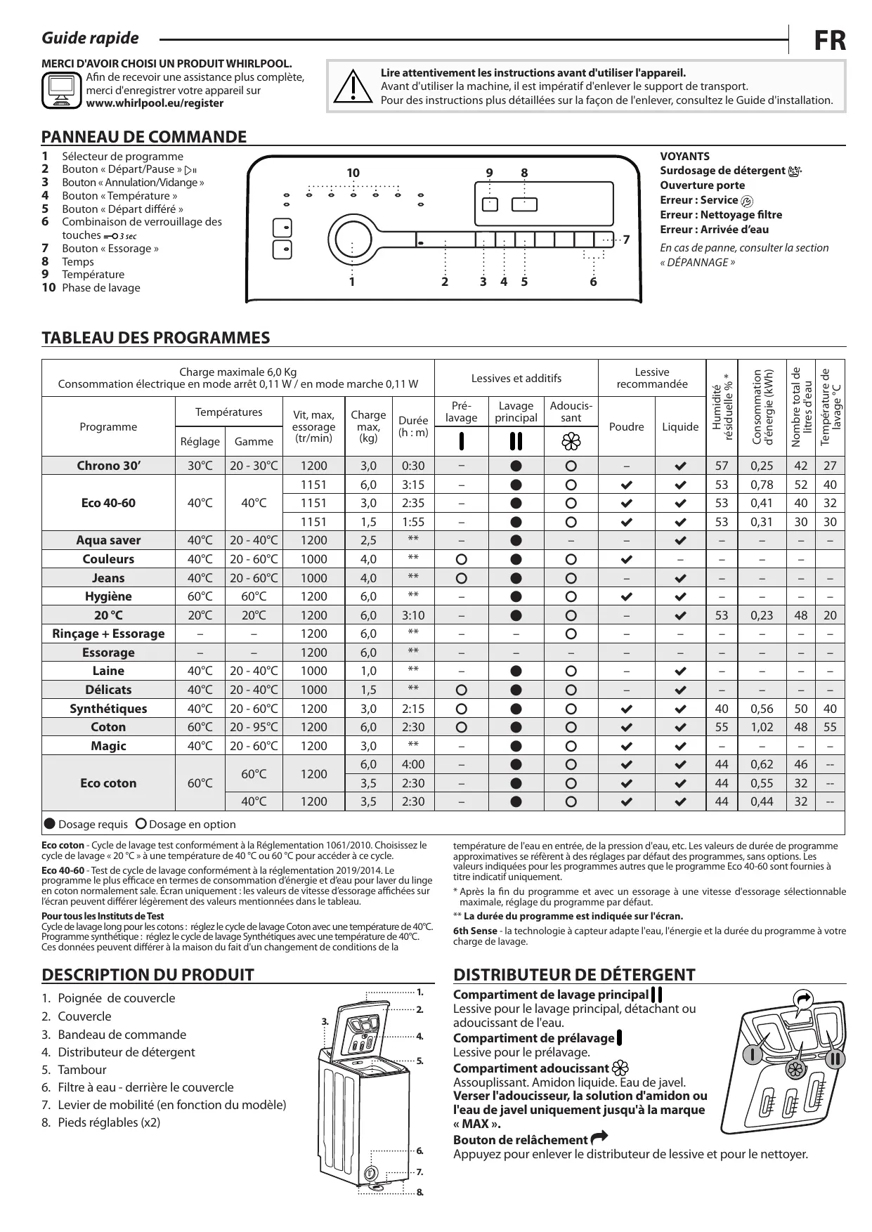 TDLRB6242BSFR/N - Lave linge top WHIRLPOOL - Notice d'utilisation et mode d'emploi gratuit