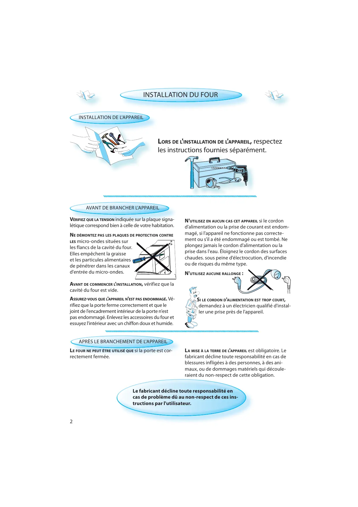 LE FOUR NE PEUT ÊTRE UTILISÉ QUE si la porte est correctement fermée. LA MISE À LA TERRE DE L'APPAREIL est obligatoire. Le fabricant décline toute responsabilité en cas de blessures infligées à des personnes, à des animaux, ou de dommages matériels qui découleraient du non-respect de cette obligation. Le fabricant décline toute responsabilité en cas de problème dû au non-respect de ces instructions par l'utilisateur.