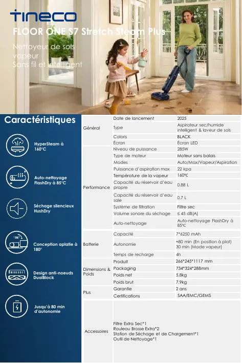 | Fonctions principales | Aspiration, lavage, séchage rapide, détection automatique de la saleté |